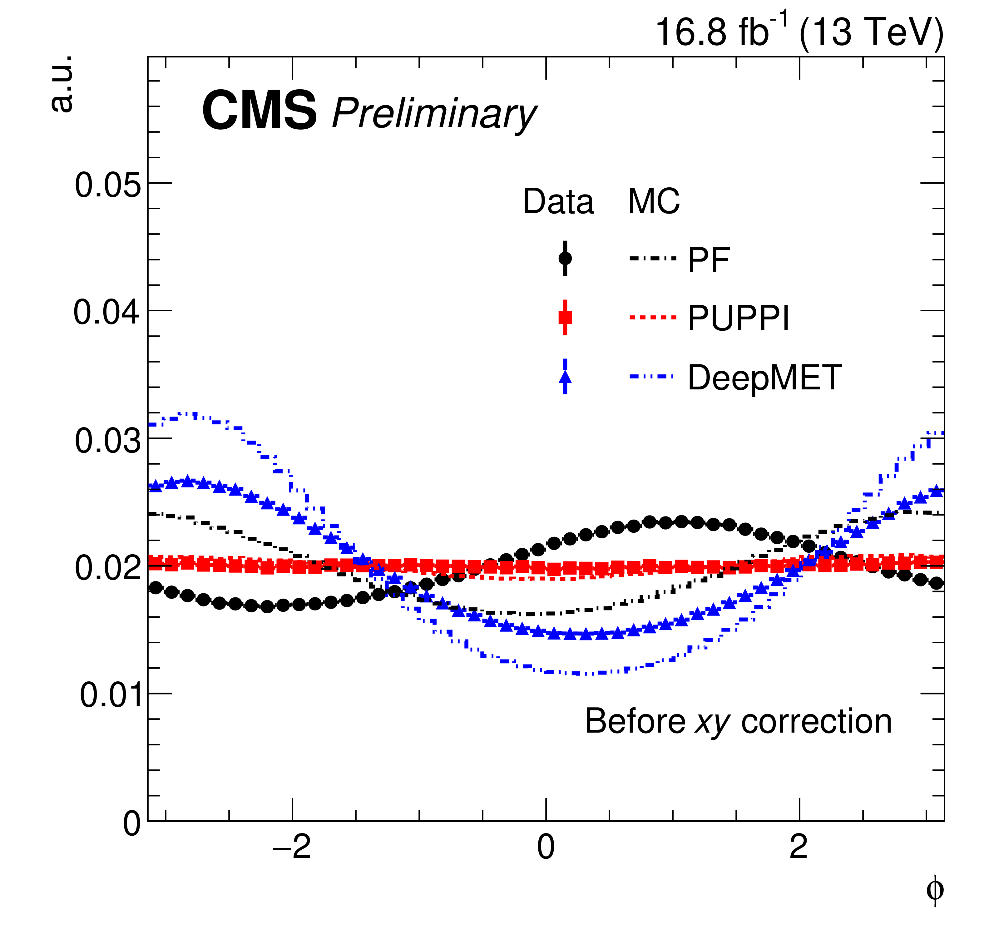 The $ \phi $ distribution of different $ p_{\mathrm{T}}^\text{miss} $ estimators before (left) and after (right) $ xy $ corrections, in data (markers) and MC simulations (dashed) after the $ \mathrm{Z}\to\mu\mu $ selections. |