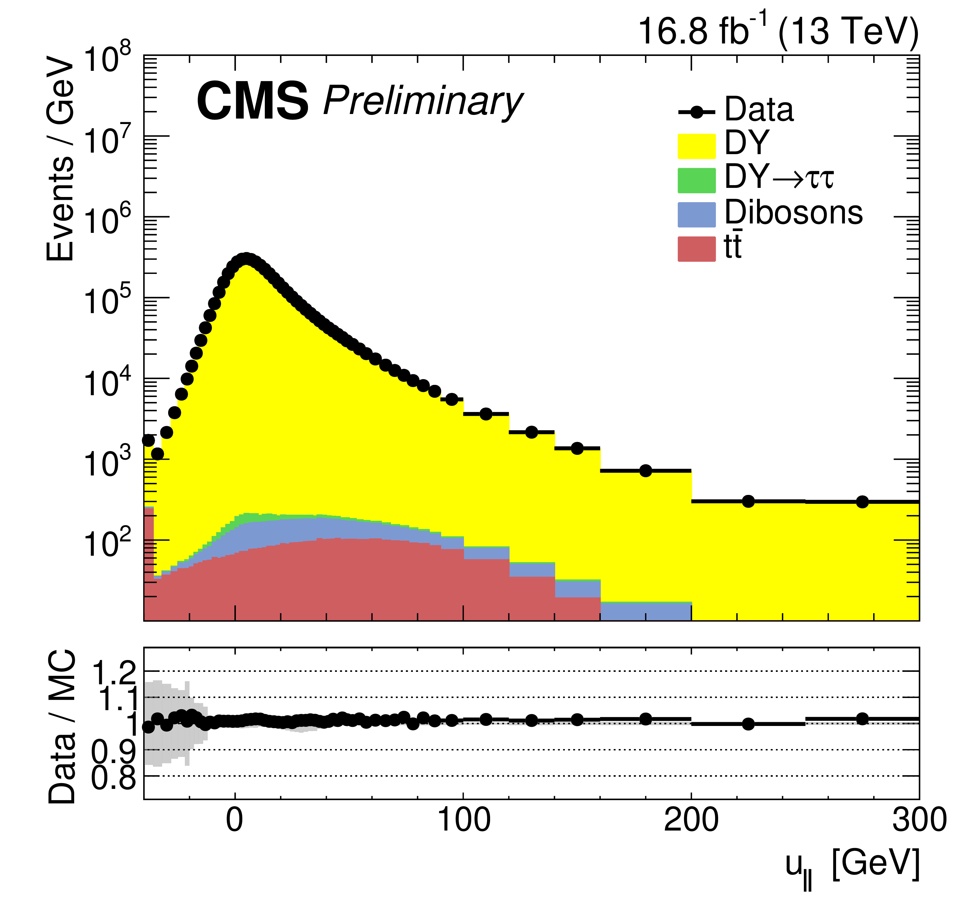 Data-MC comparisons of DeepMET $ p_{\mathrm{T}}^\text{miss} $ (top left), recoil $ p_{\mathrm{T}} $ (top right), $ u_{\parallel} $ (bottom left), and $ u_{\perp} $ (bottom right) after the quantile correction. The underflow (overflow) contents are included in the first (last) bin. |