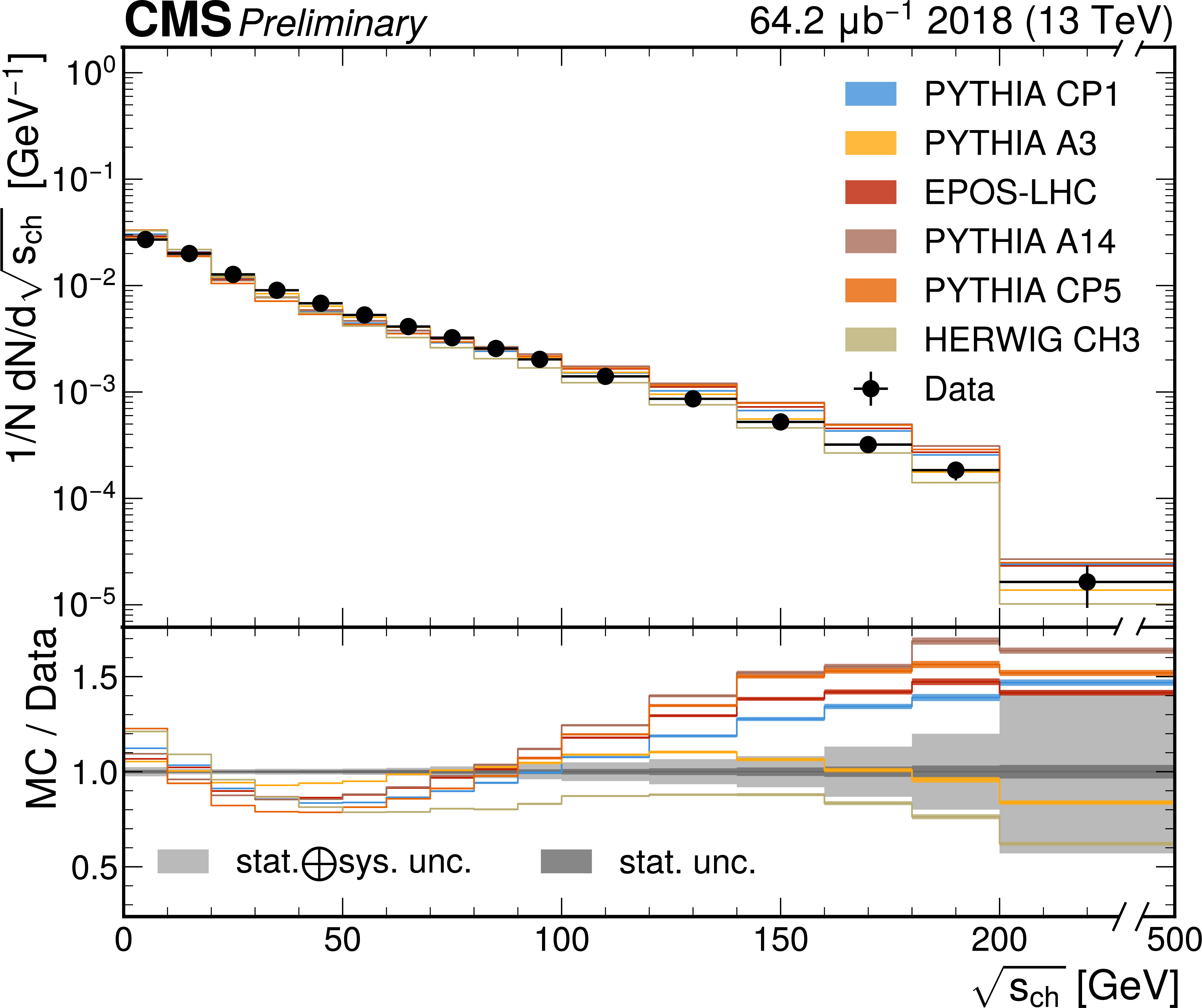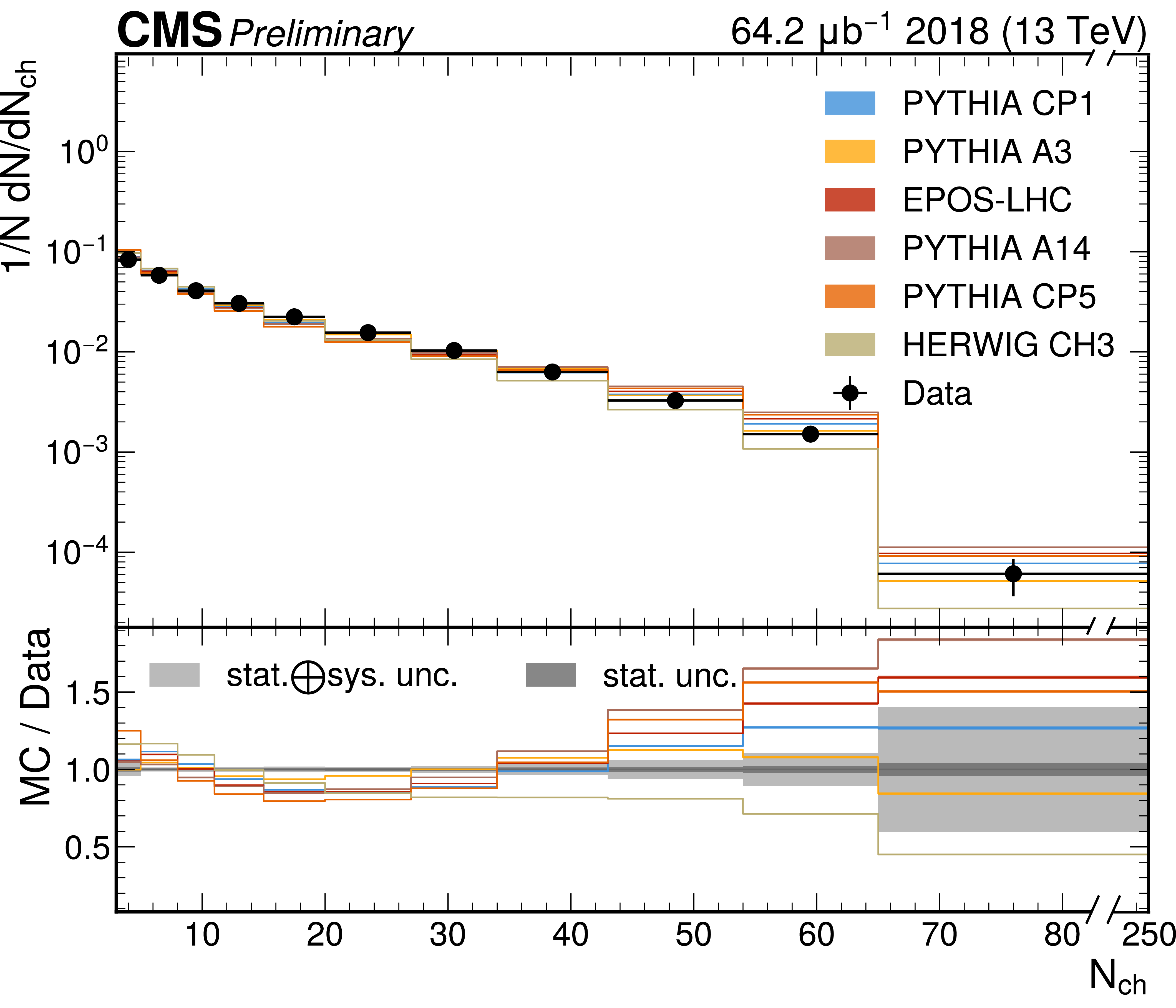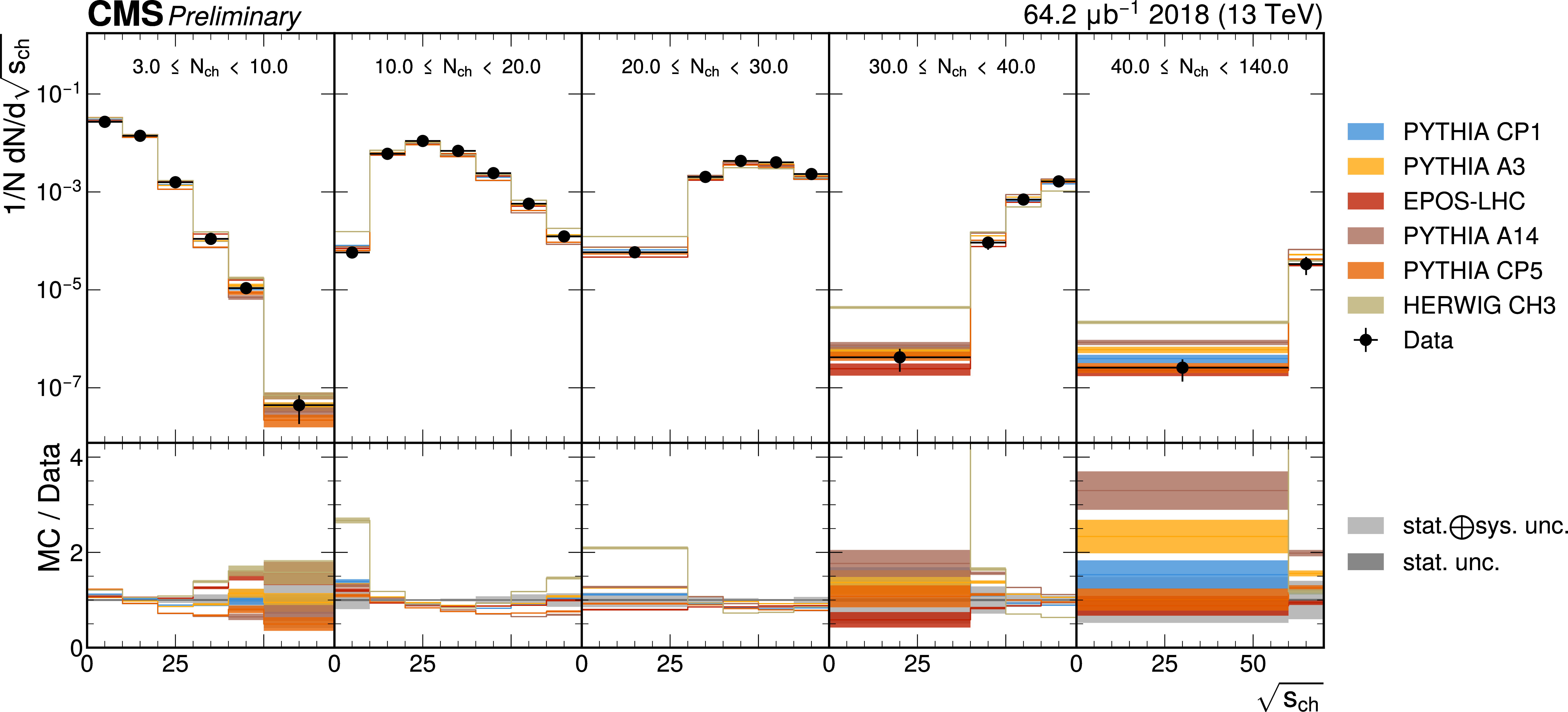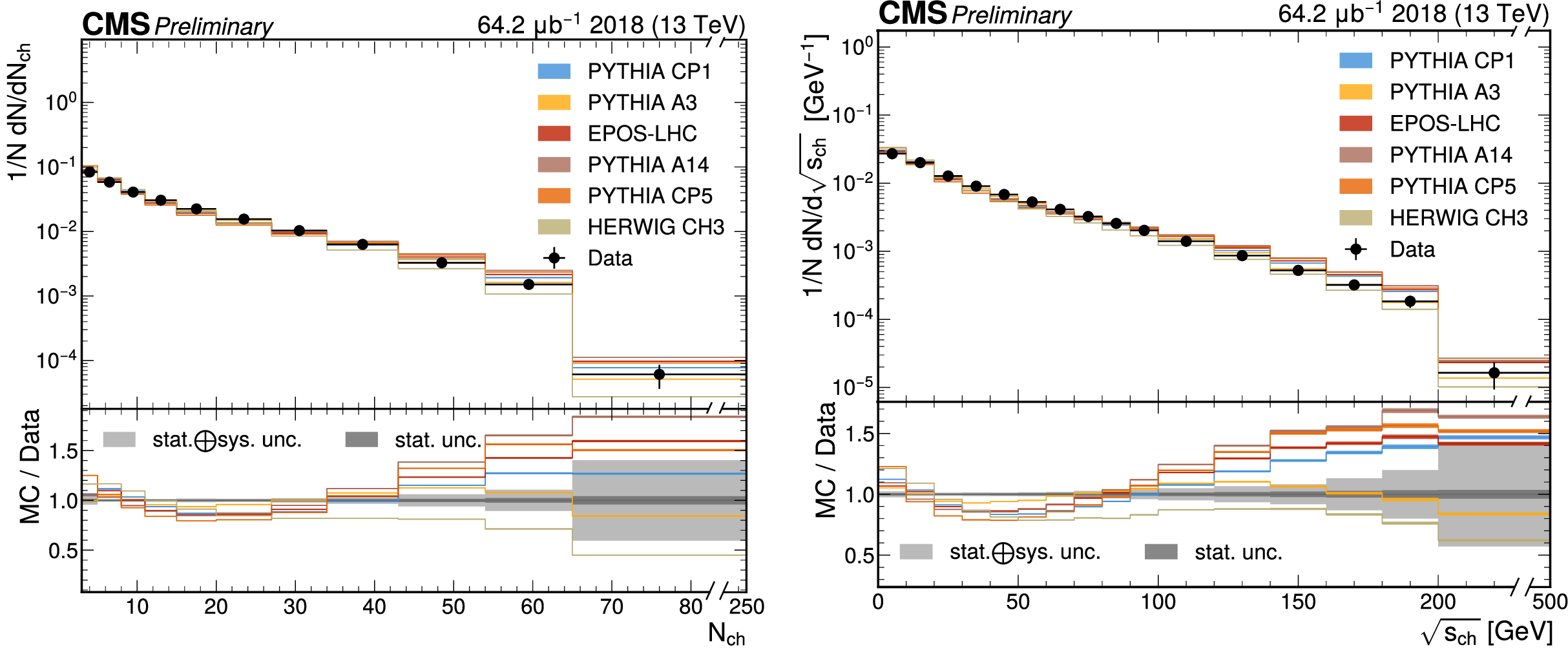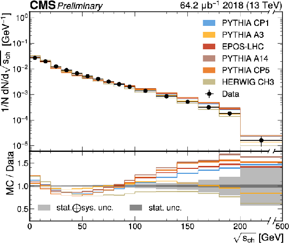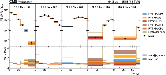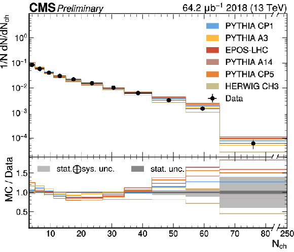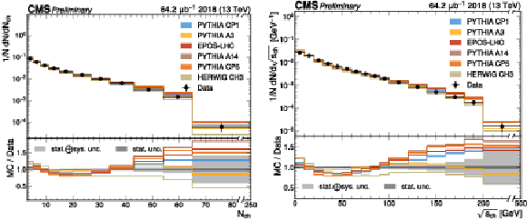 The unfolded results for (left) the particle multiplcity, and (right) invariant mass, compared to the nominal MC from PYTHIA CP1 tune and predictions from the PYTHIA A14, CP5, A3 tunes, the EPOS generator, and the HERWIG CH3 tune. |