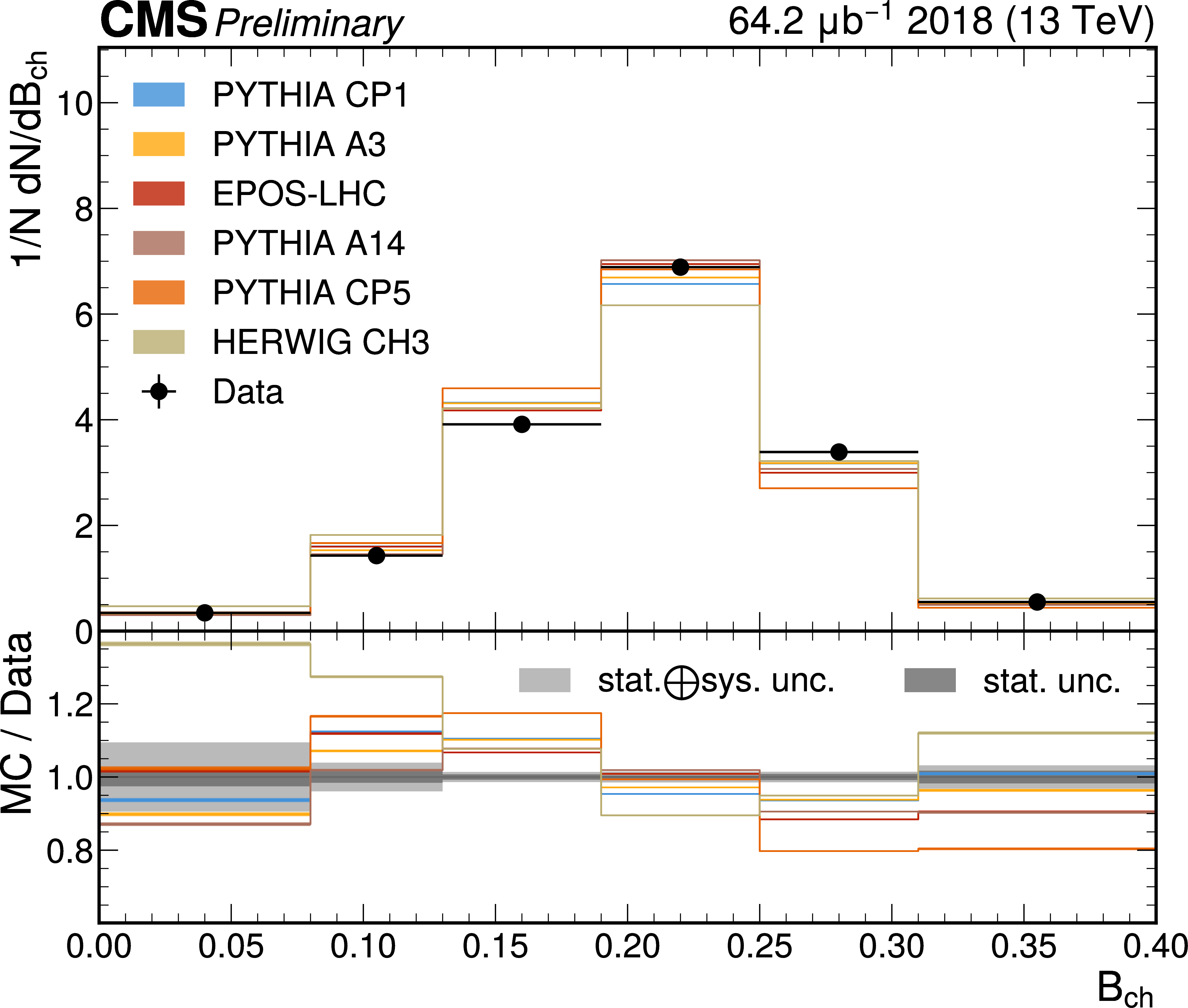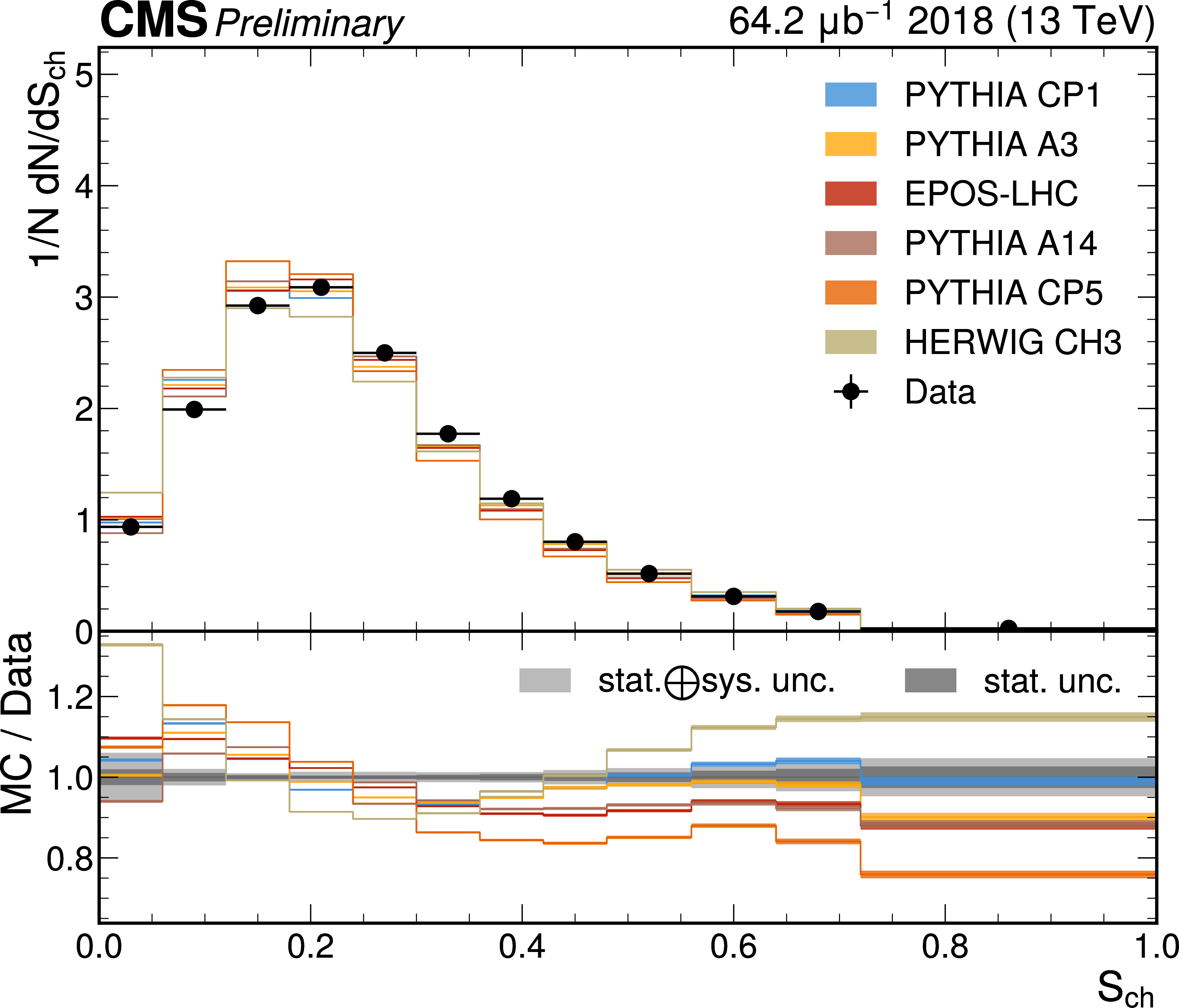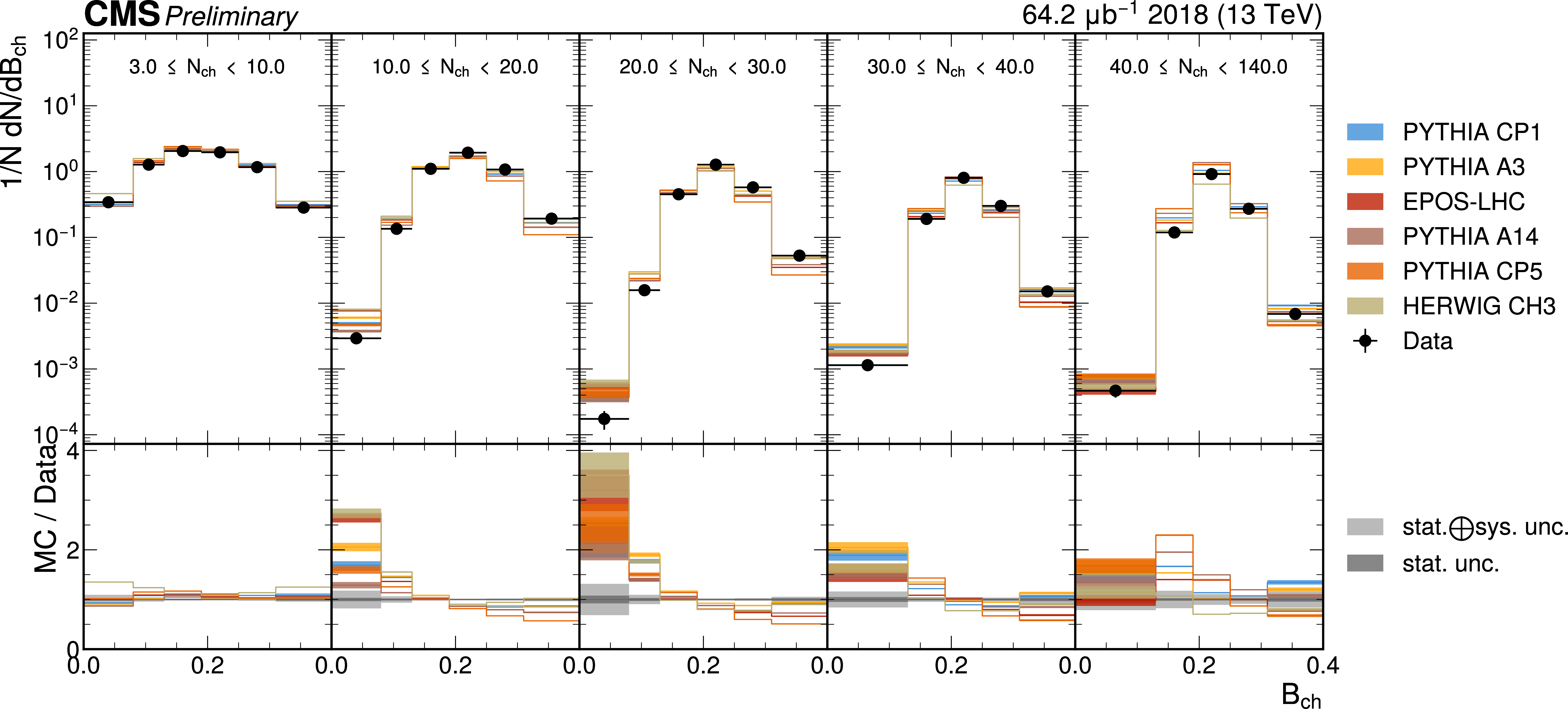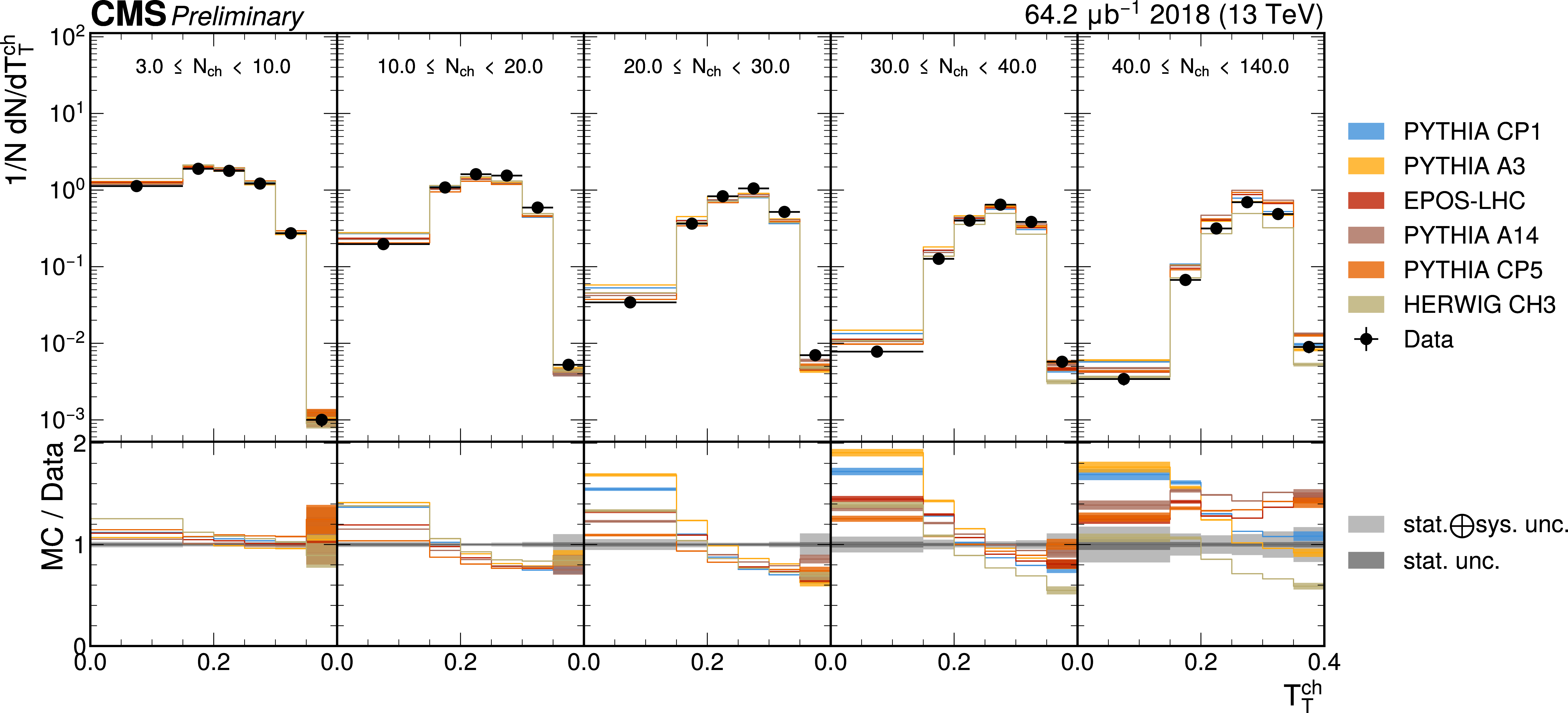 The unfolded results for (left) the particle multiplcity, and (right) invariant mass, compared to the nominal MC from PYTHIA CP1 tune and predictions from the PYTHIA A14, CP5, A3 tunes, the EPOS generator, and the HERWIG CH3 tune. |