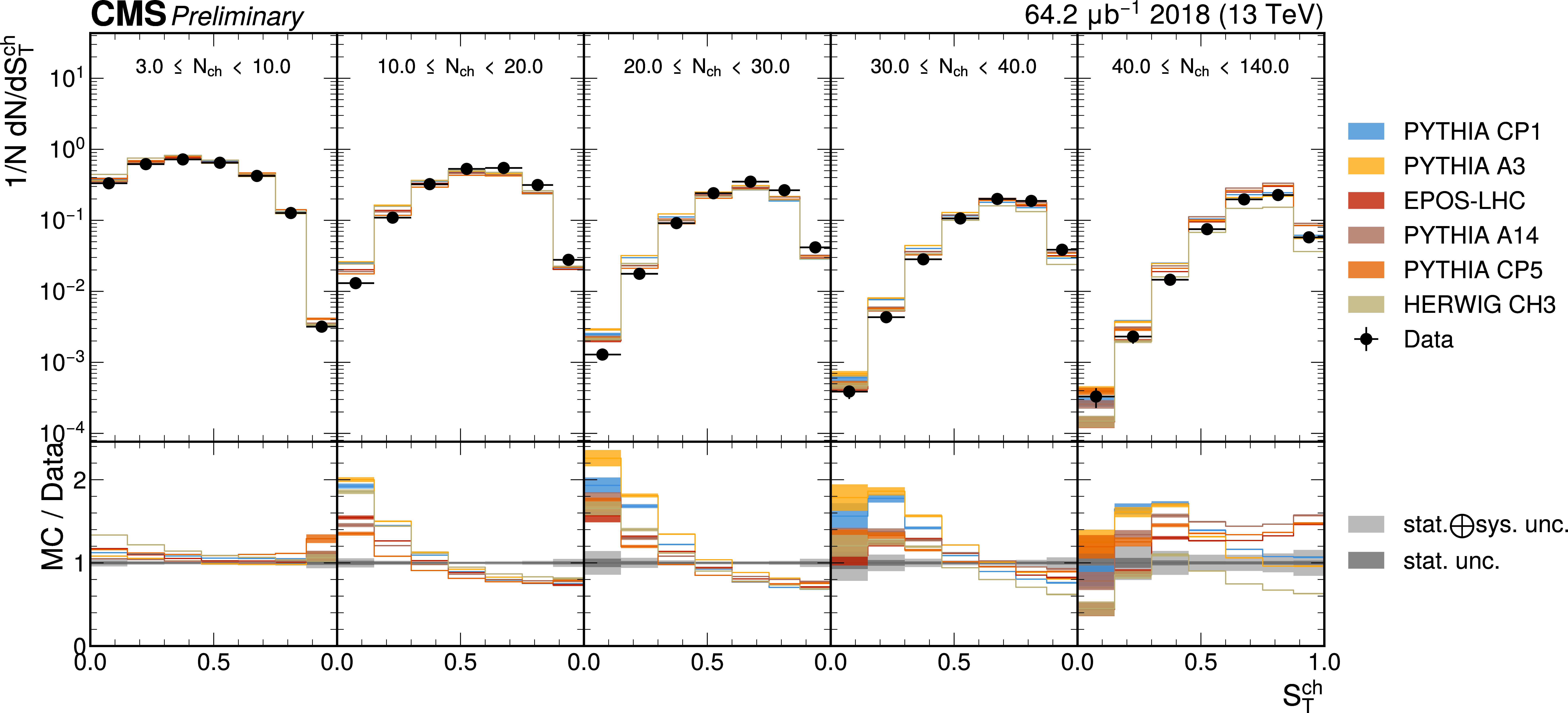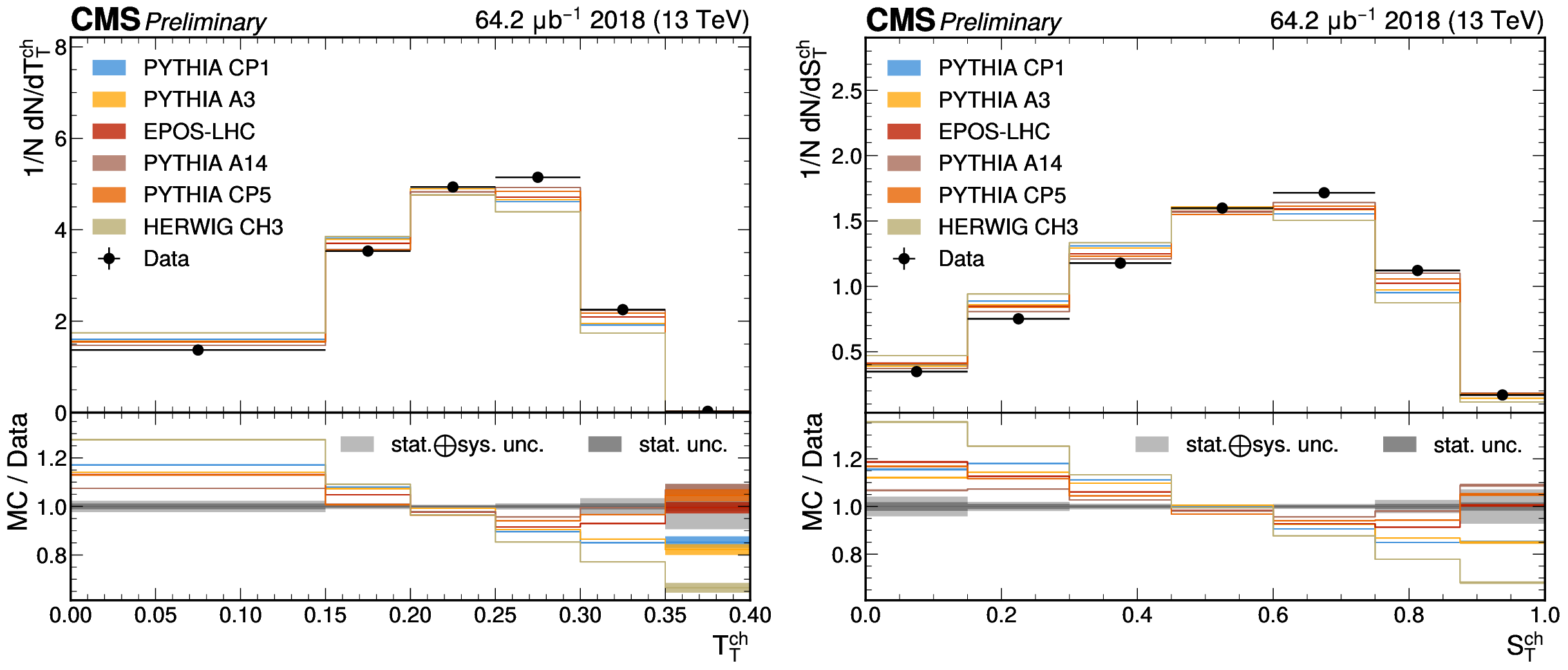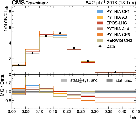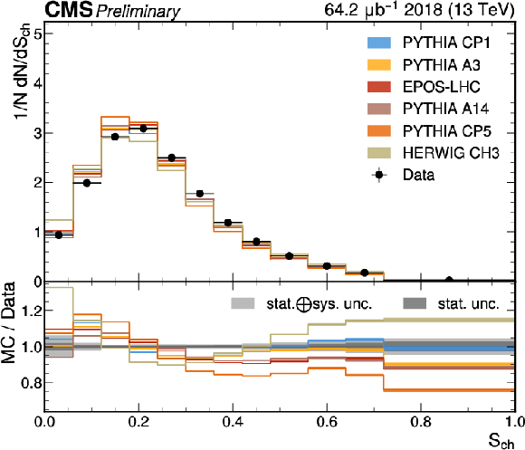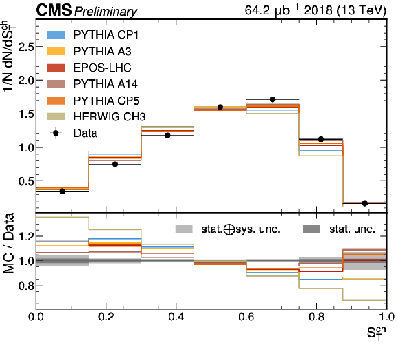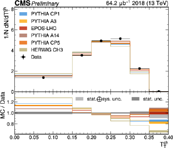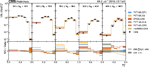 The unfolded results for (left) transverse thrust, and (right) transverse sphericity compared to the nominal MC from PYTHIA CP1 tune and predictions from the PYTHIA A14, CP5, A3 tunes, the EPOS generator, and the HERWIG CH3 tune. |