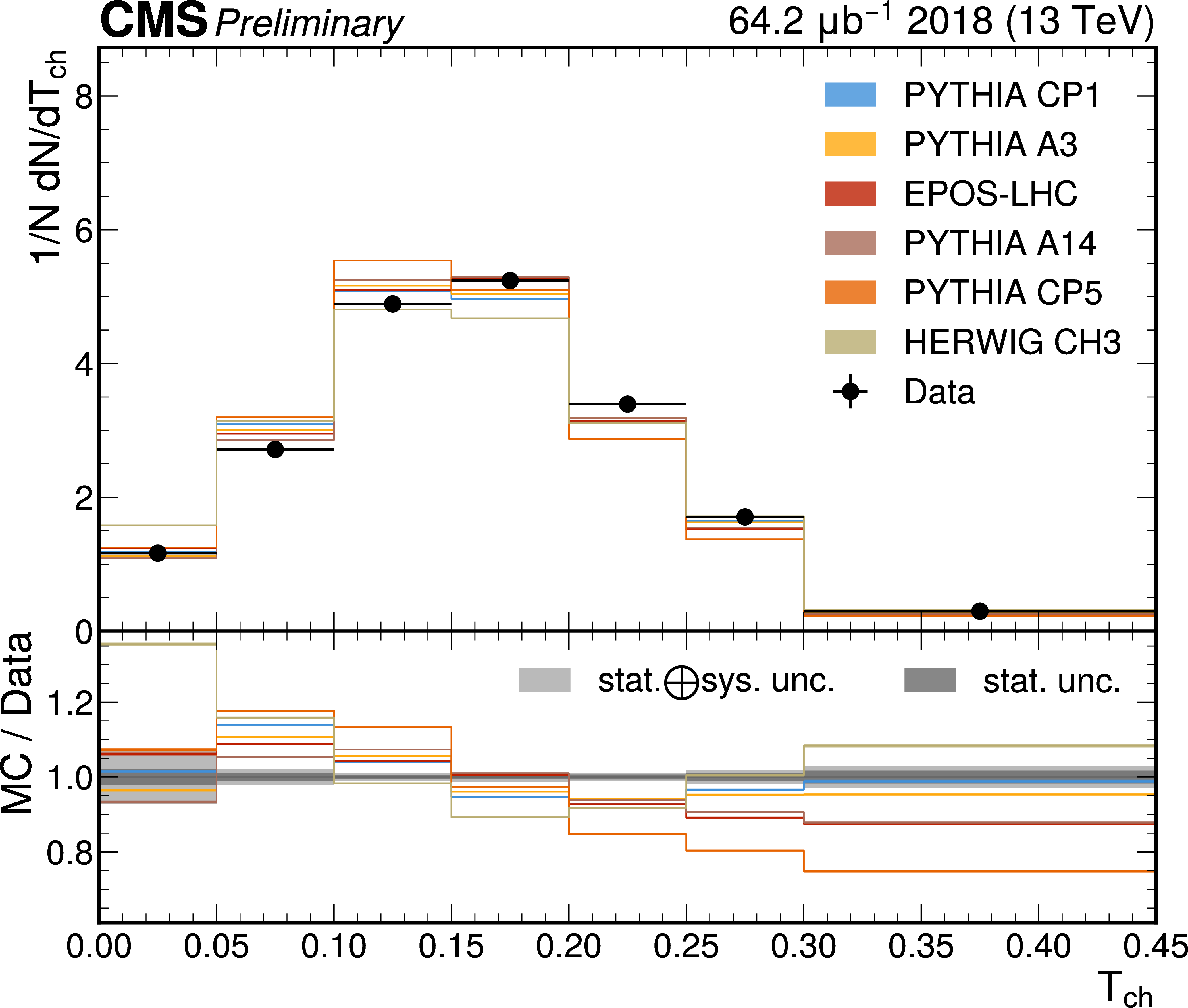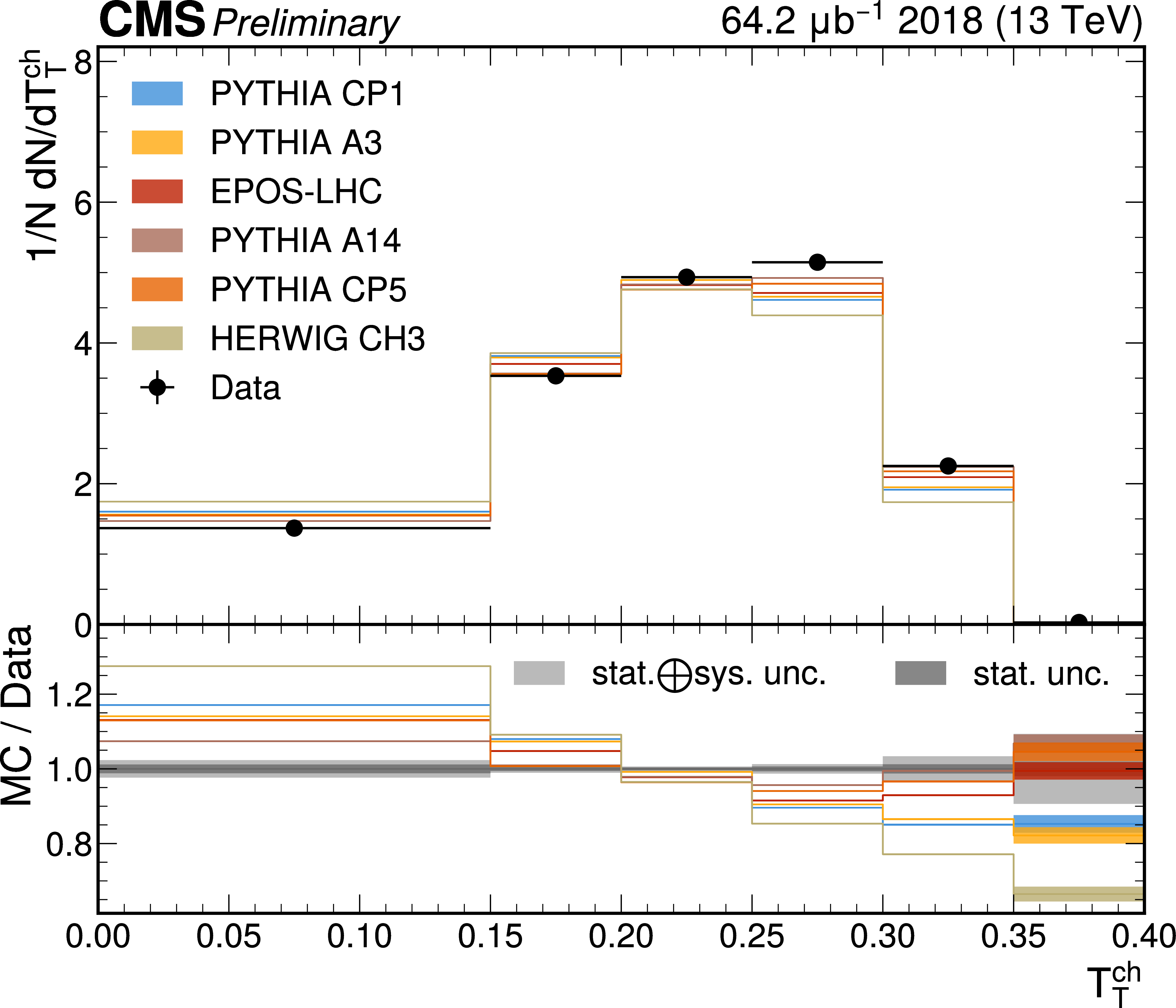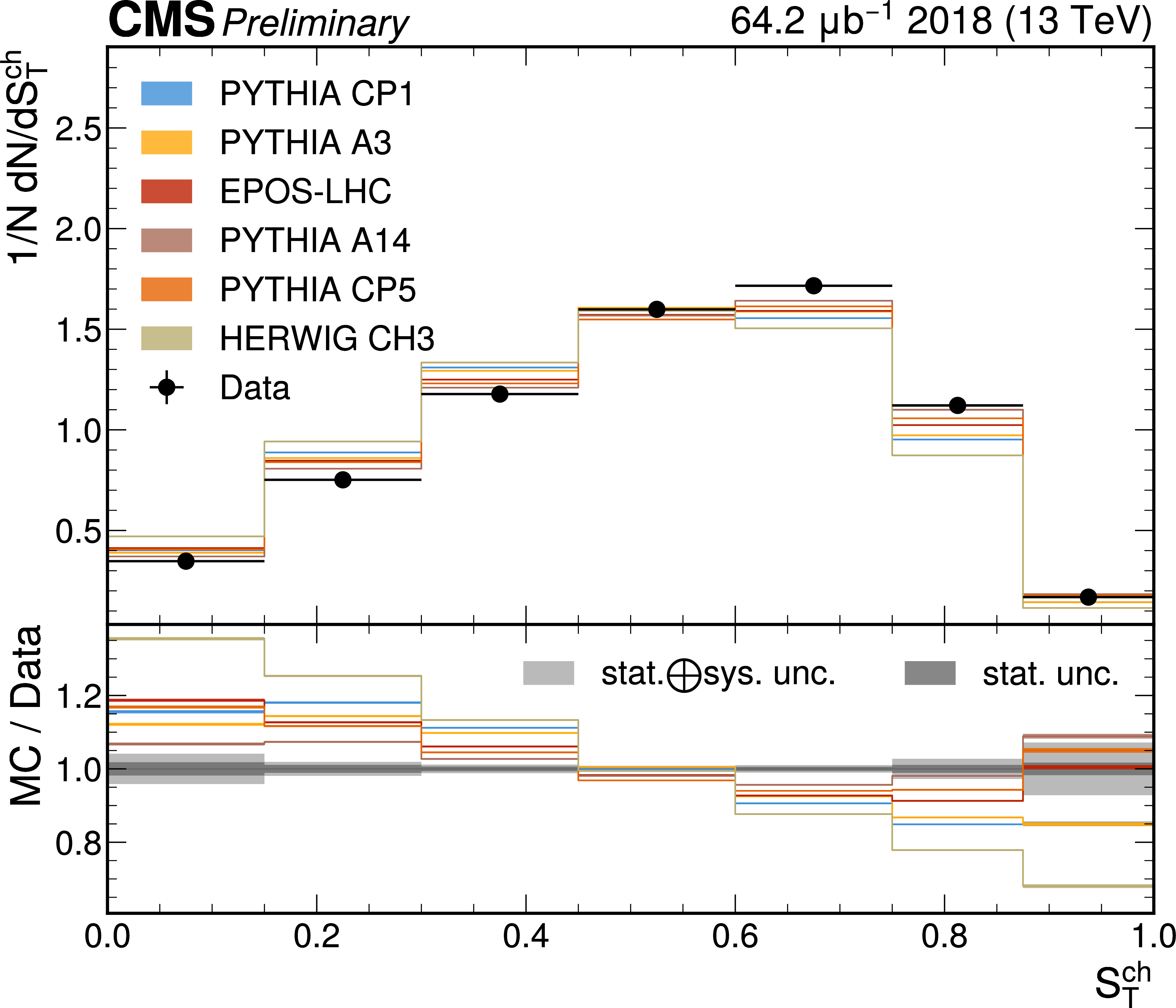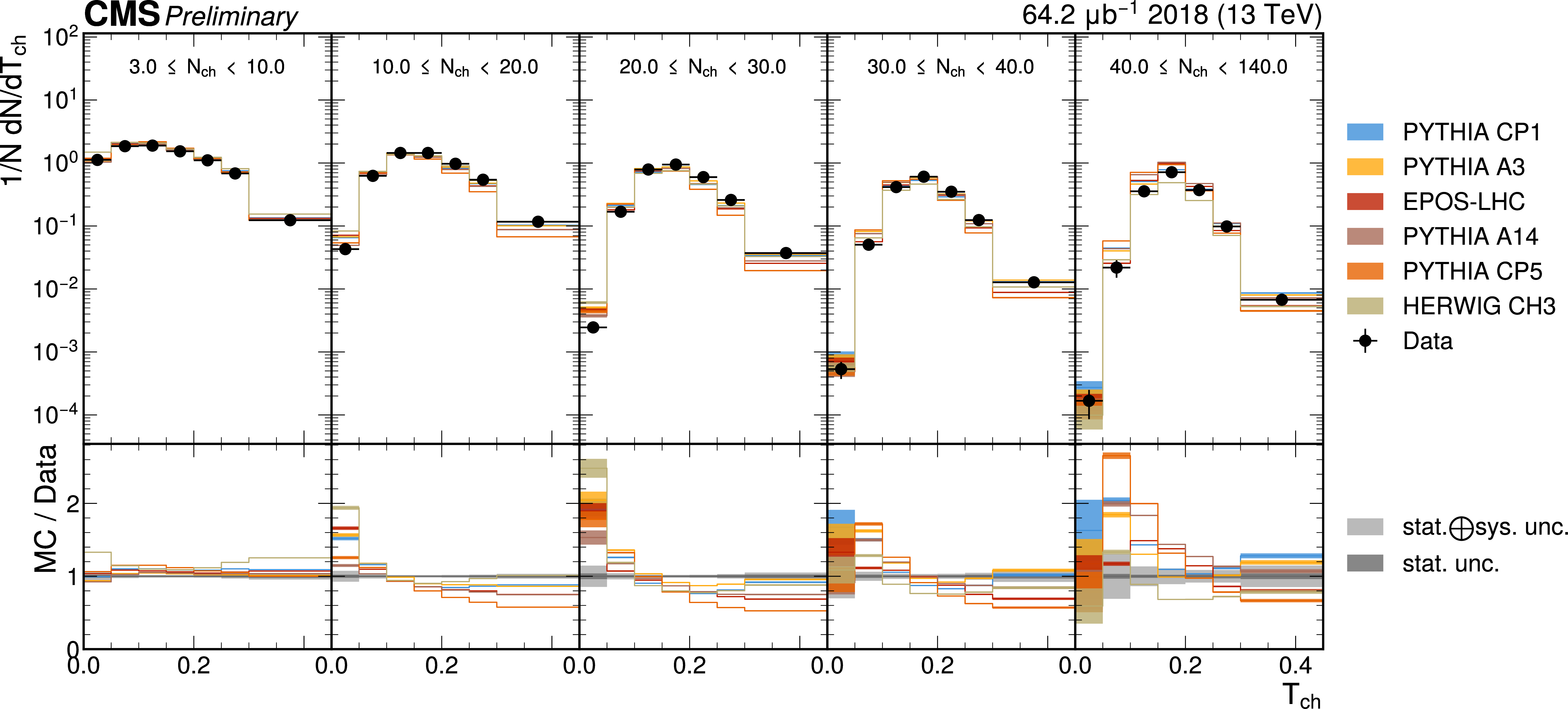 The unfolded results for (left) transverse thrust, and (right) transverse sphericity compared to the nominal MC from PYTHIA CP1 tune and predictions from the PYTHIA A14, CP5, A3 tunes, the EPOS generator, and the HERWIG CH3 tune. |