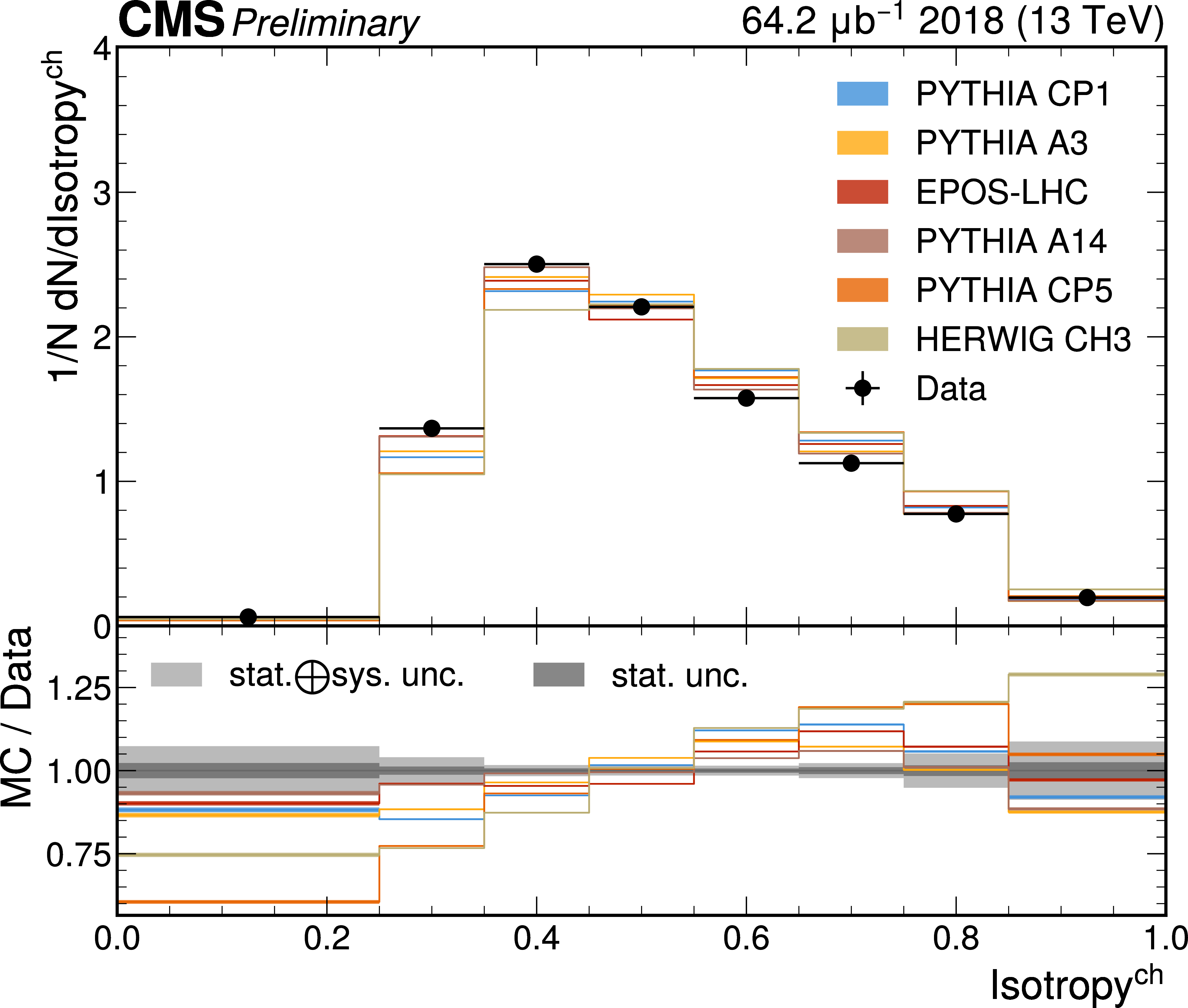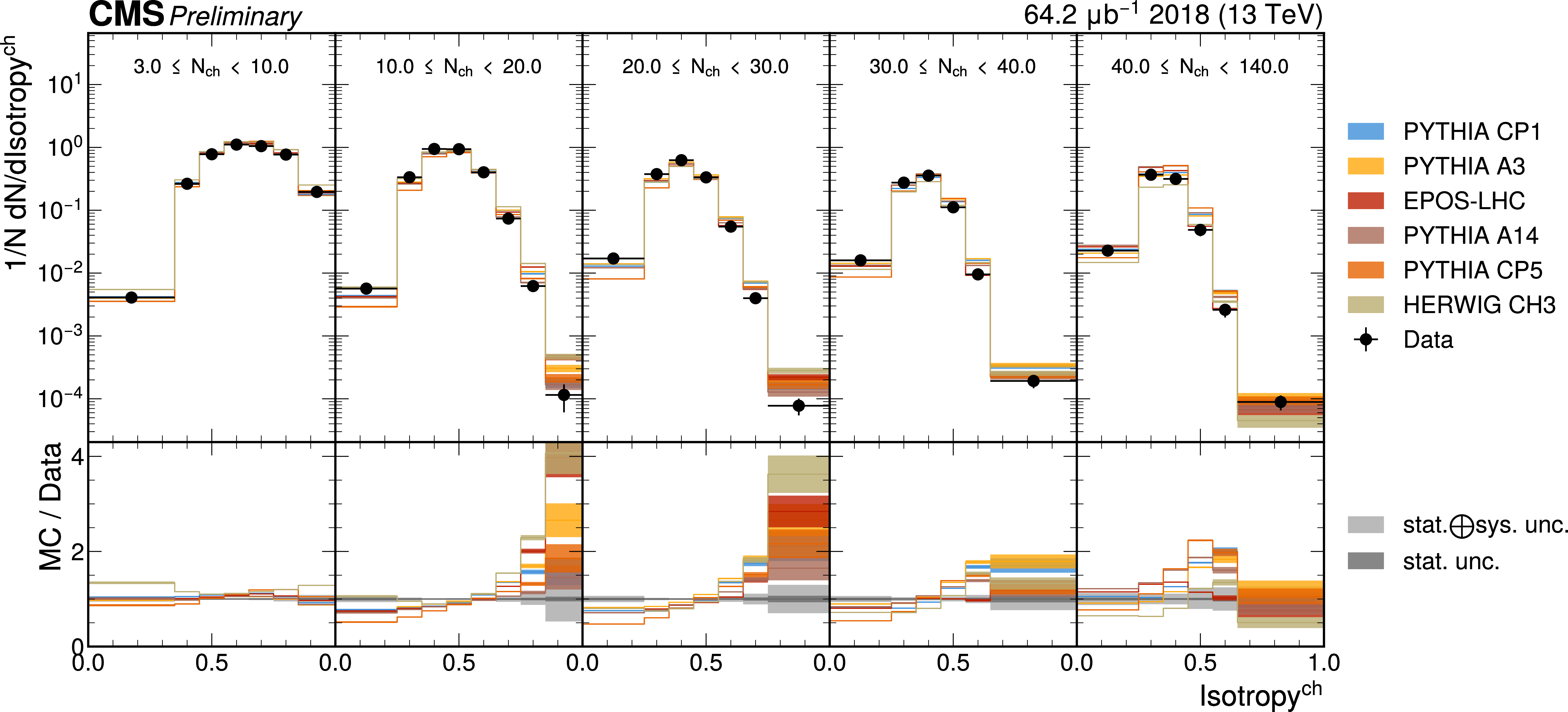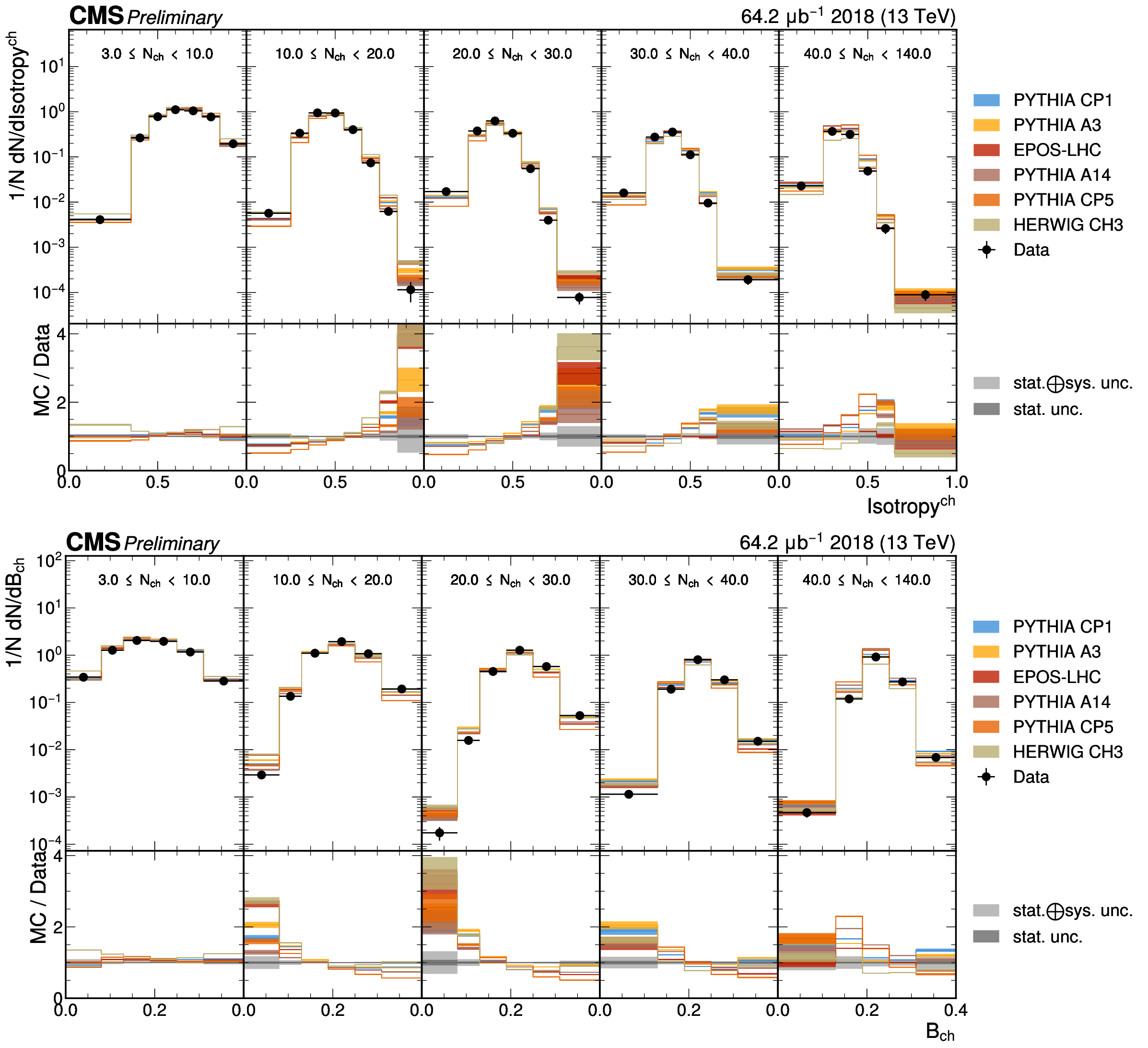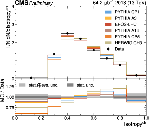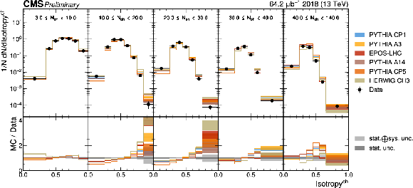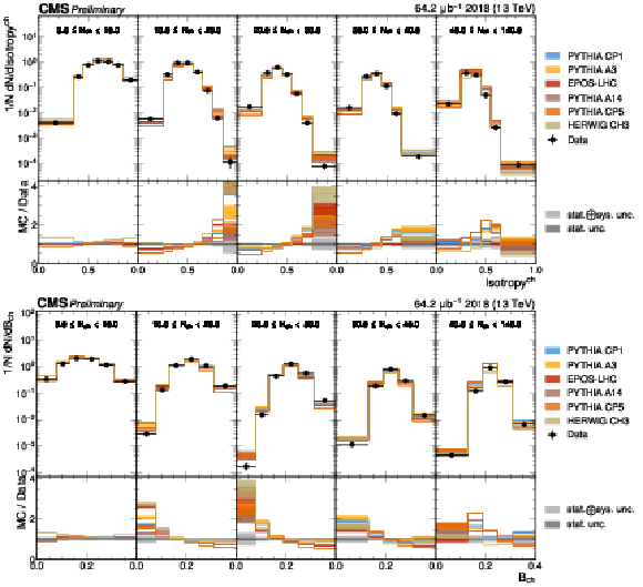 The unfolded distributions of even Isotropy (upper) and Broadening (lower) in slices of charged-particle multiplicity compared to the nominal MC from PYTHIA CP1 tune and MC predictions from the PYTHIA A14, CP5, A3 tunes, the EPOS generator, and the HERWIG CH3 tune. |