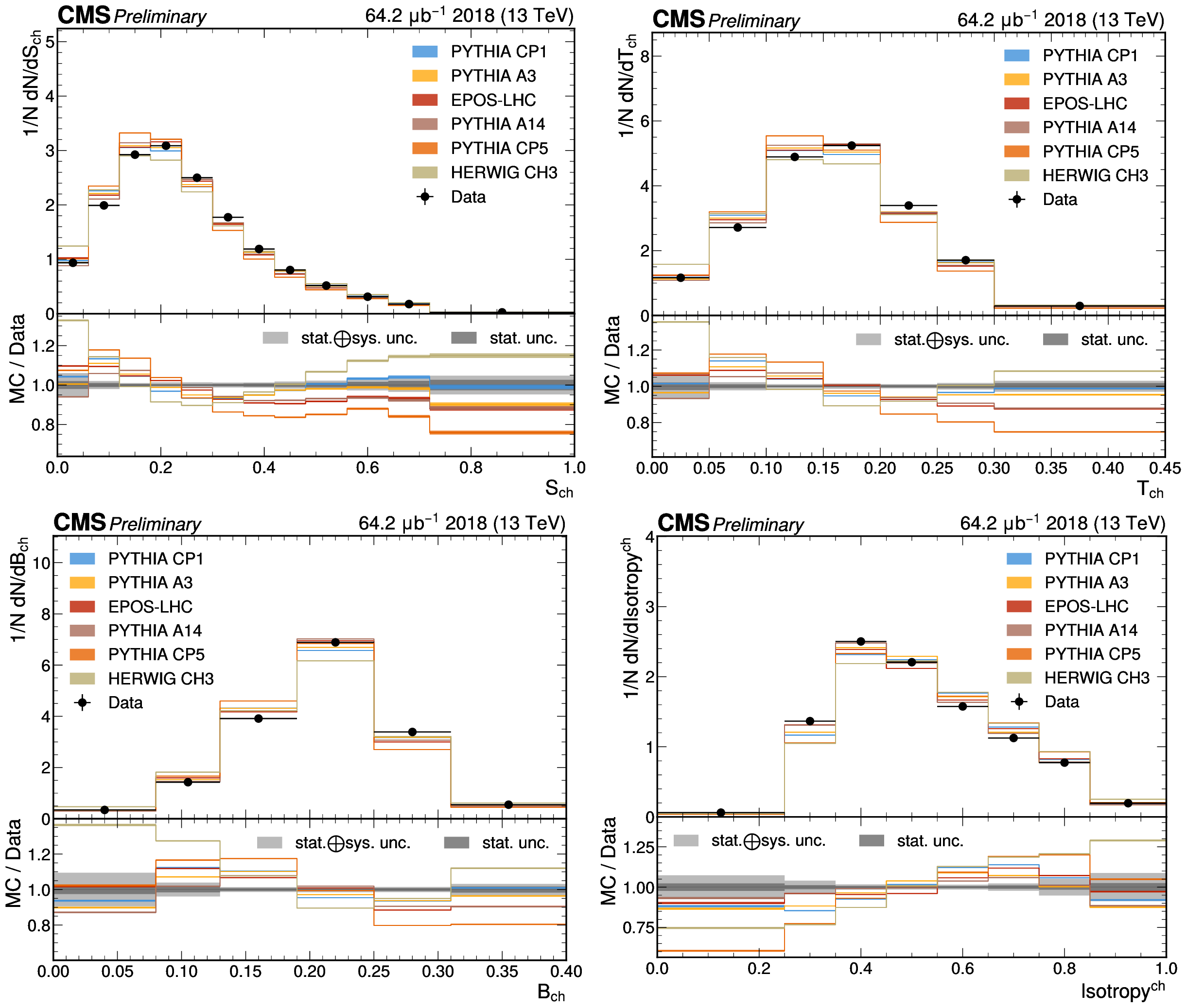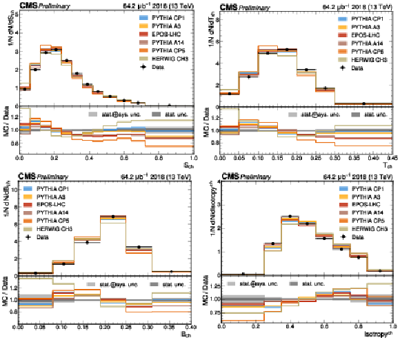 The unfolded results for (upper left) sphericity, (upper right) thrust, (lower left) broadening, and (lower right) isotropy compared to the nominal MC from PYTHIA CP1 tune and MC predictions from the PYTHIA A14, CP5, A3 tunes, the EPOS generator, and the HERWIG CH3 tune. |