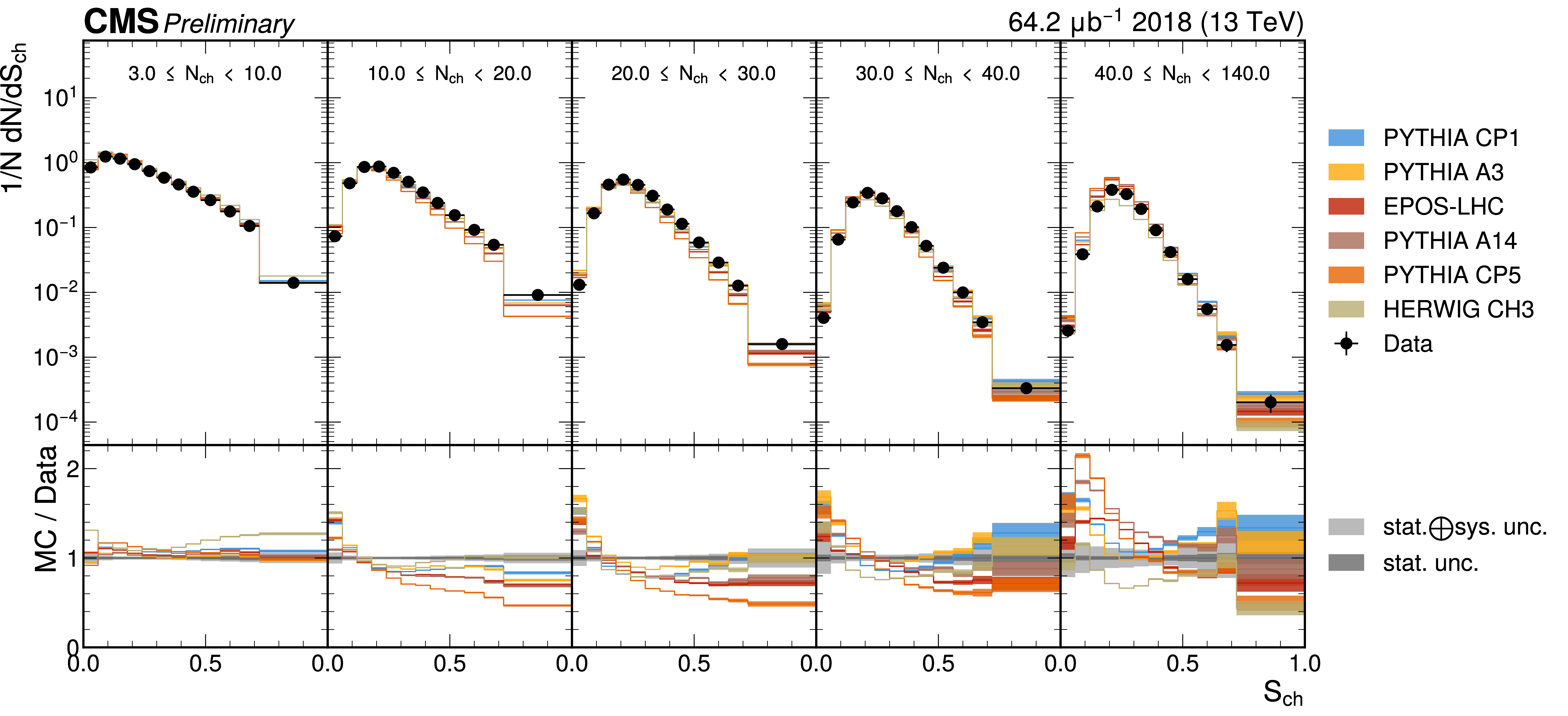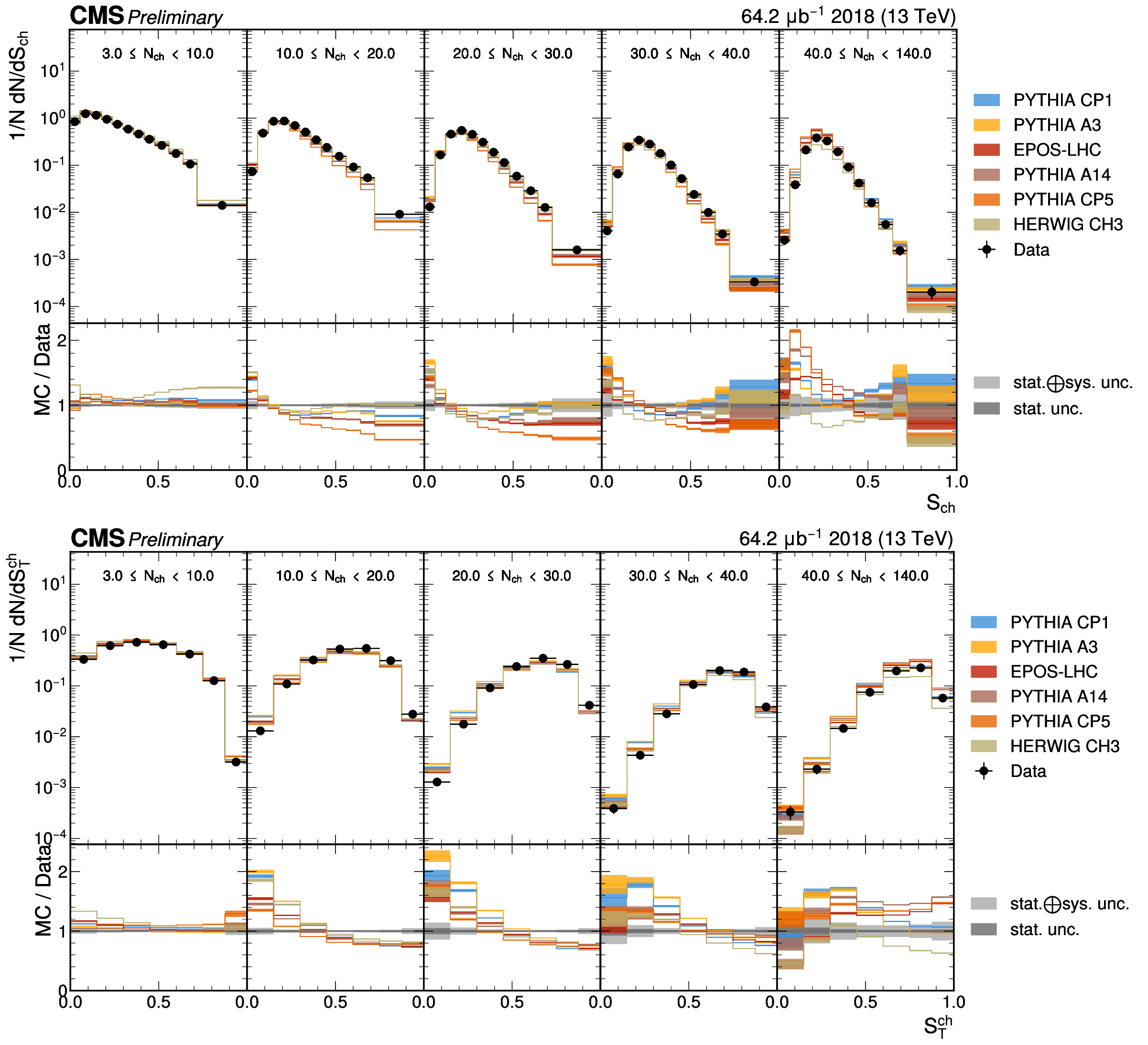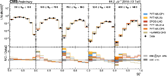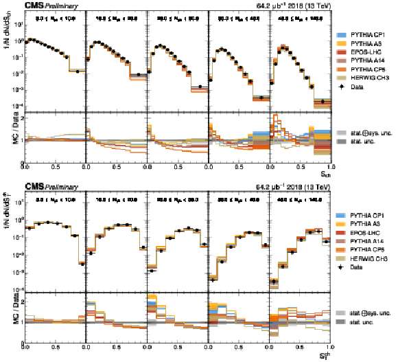 The unfolded distributions of sphericity (upper) and transverse sphericity (lower) in slices of charged-particle multiplicity compared to the nominal MC from PYTHIA CP1 tune and MC predictions from the PYTHIA A14, CP5, A3 tunes, the EPOS generator, and the HERWIG CH3 tune. |