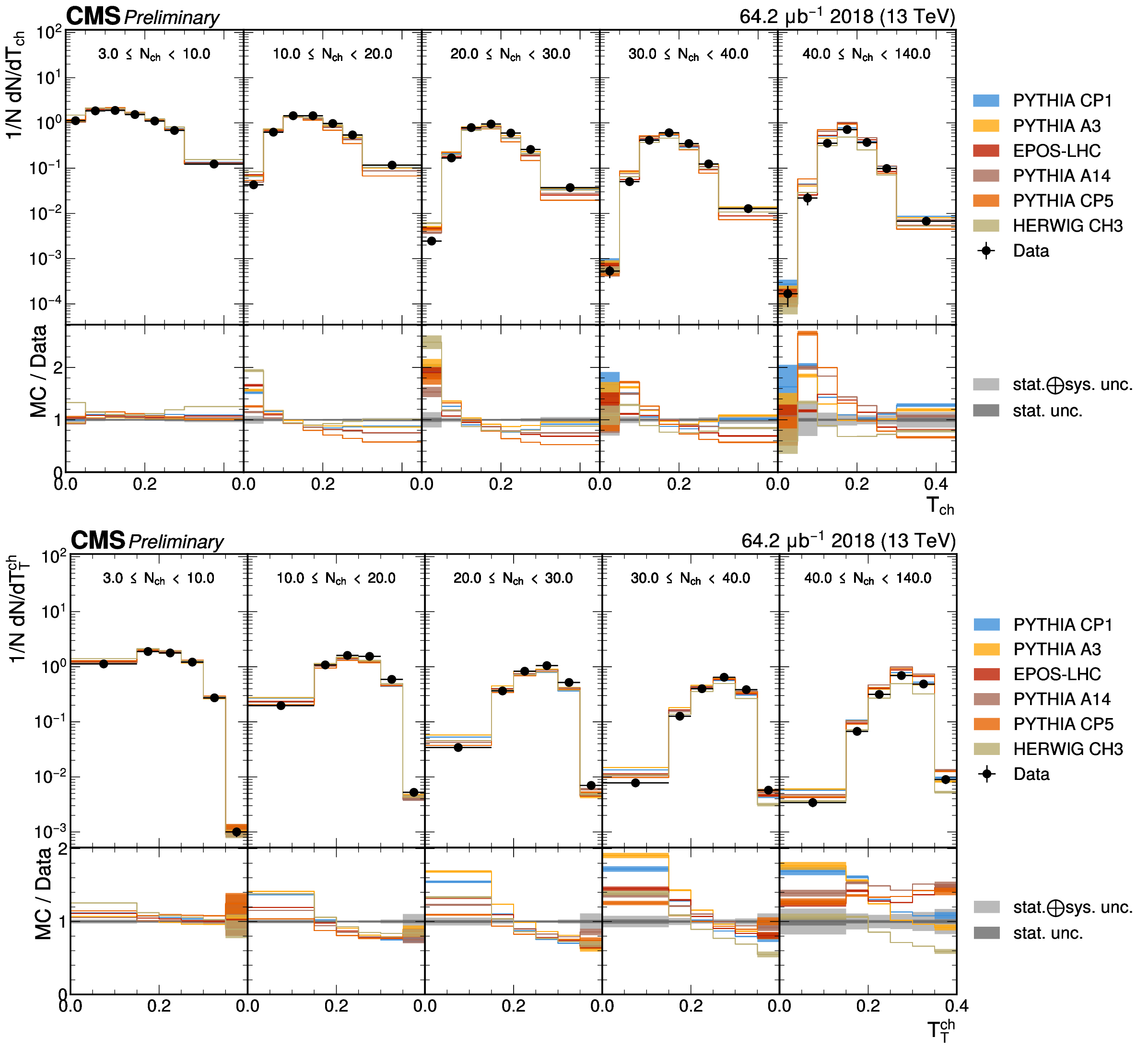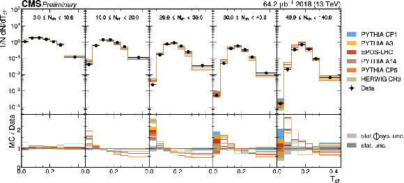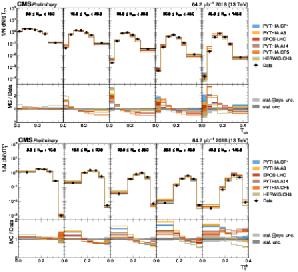 The unfolded distributions of thrust (upper) and transverse thrust (lower) in slices of charged-particle multiplicity compared to the nominal MC from PYTHIA CP1 tune and MC predictions from the PYTHIA A14, CP5, A3 tunes, the EPOS generator, and the HERWIG CH3 tune. |