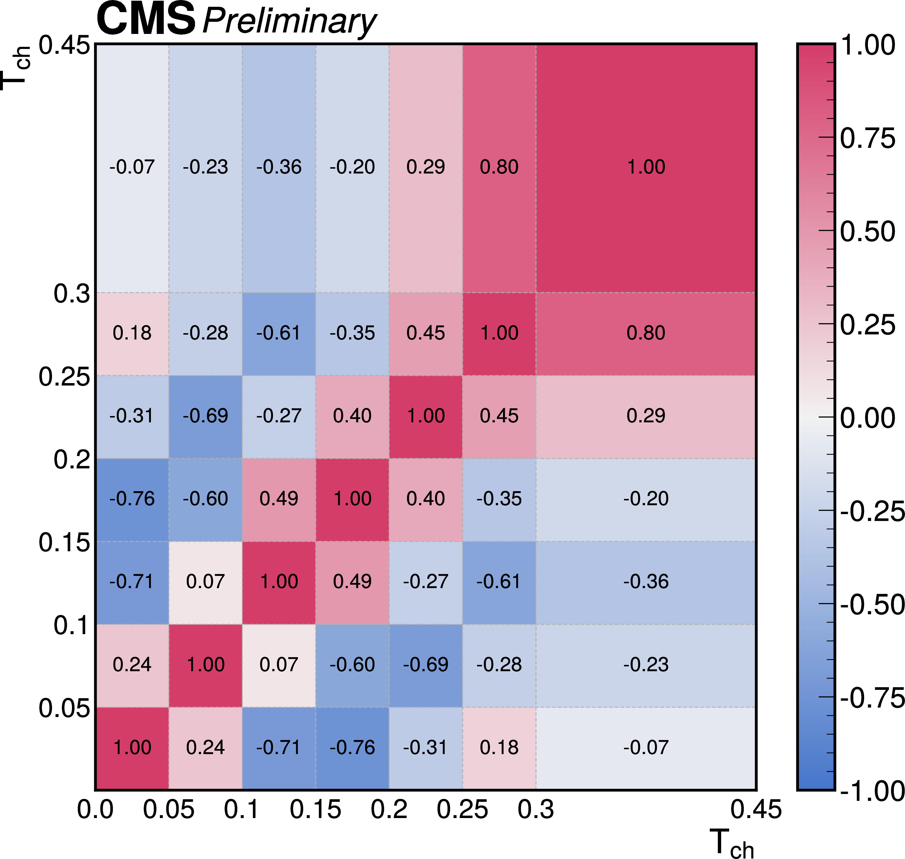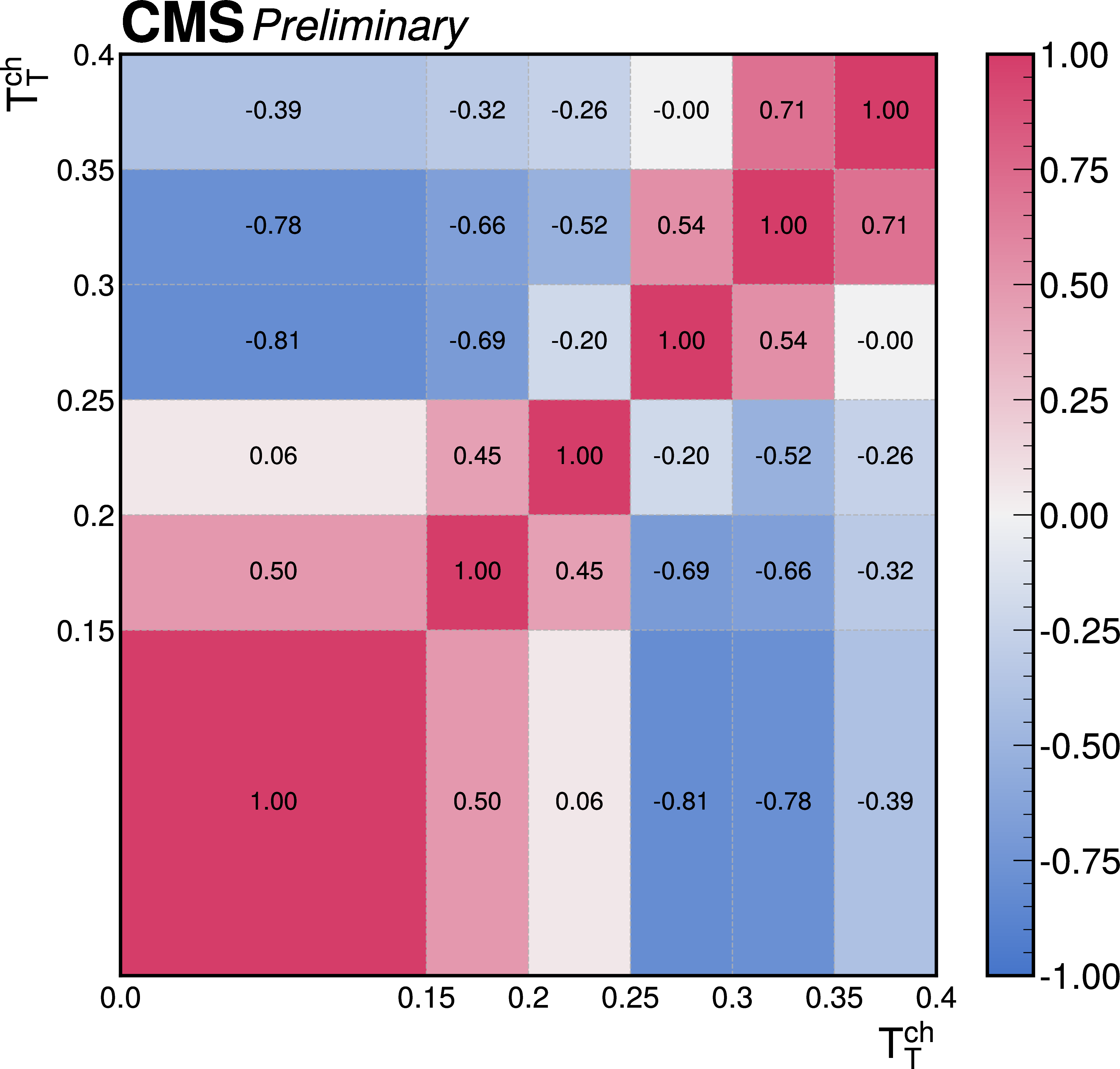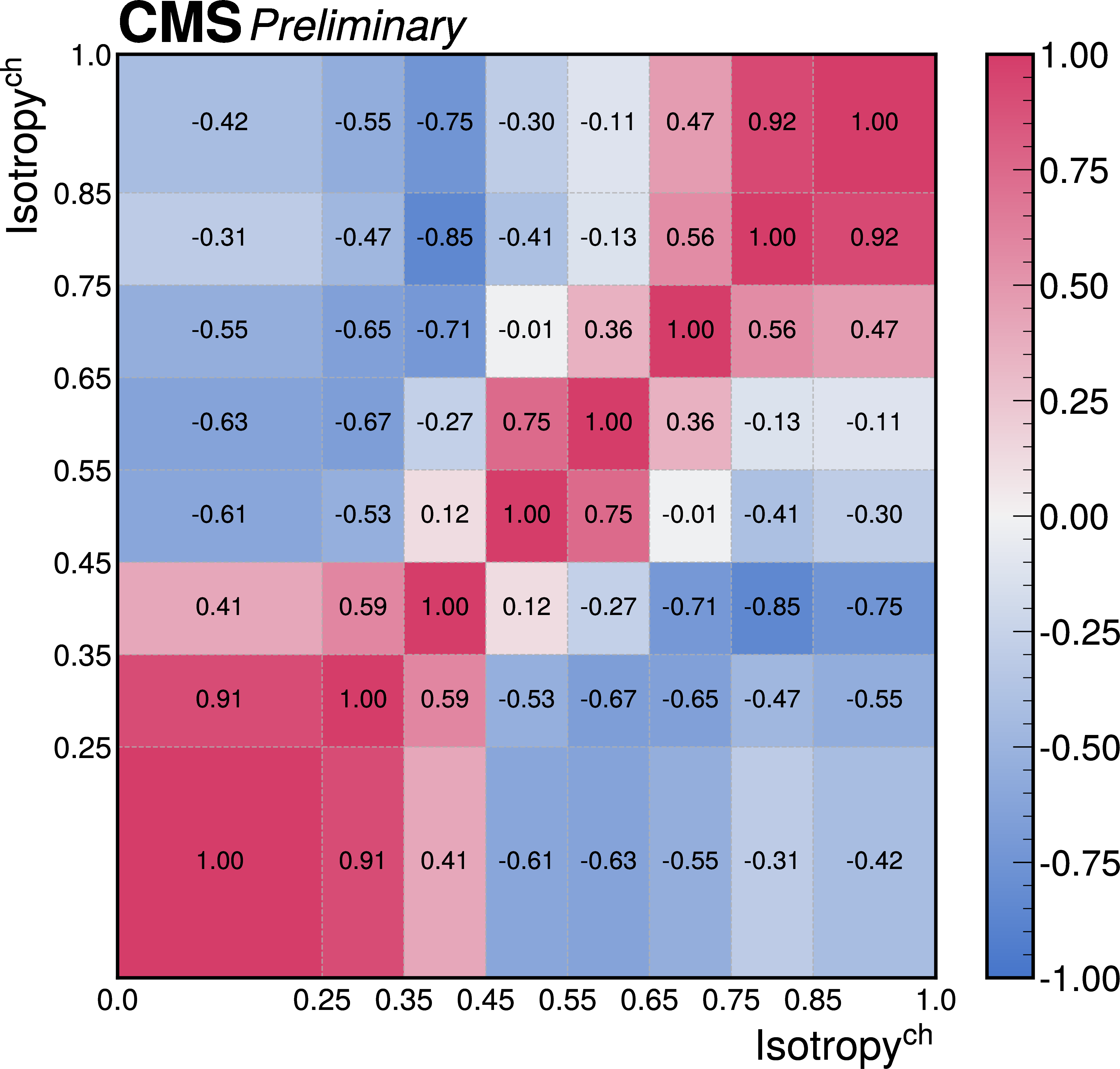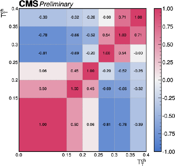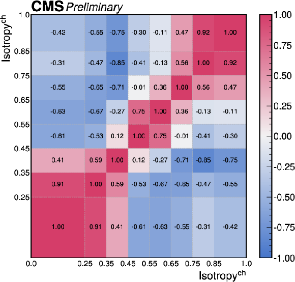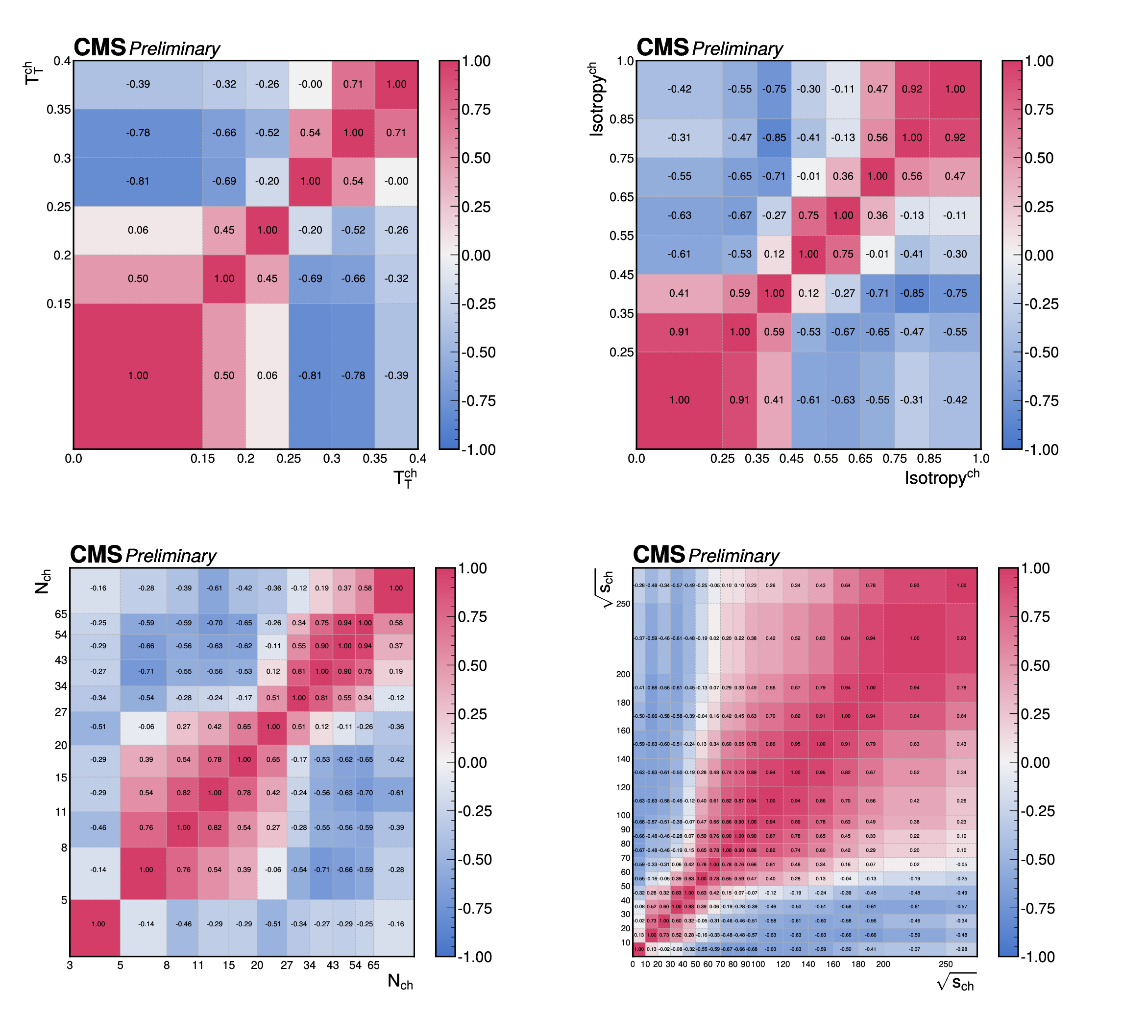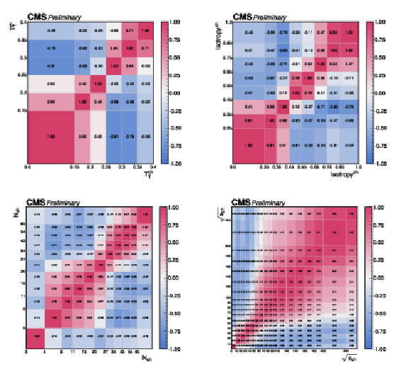 The correlations of the unfolding systematic uncertainty between bins of the event shape observables shown for (upper left) transverse thrust, (upper right) isotropy, (lower left) particle multiplicity, (lower right) invariant mass. |