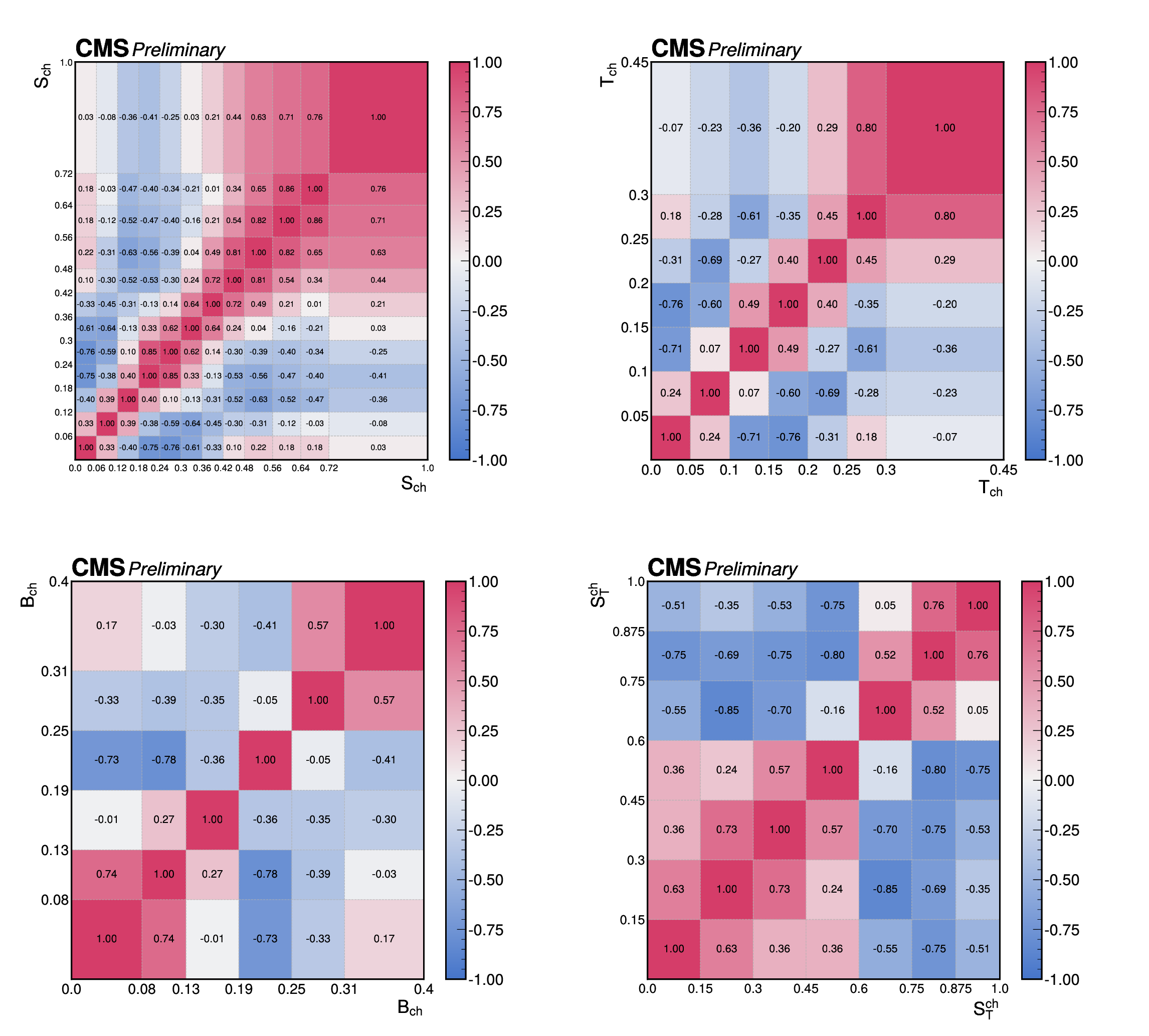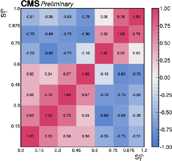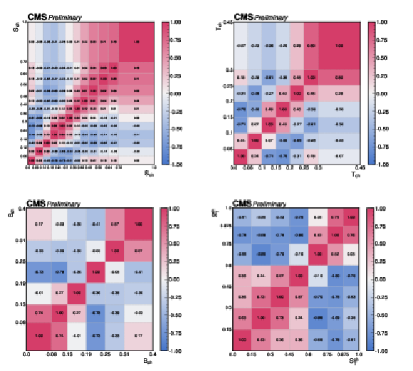 The correlations of the unfolding systematic uncertainty between bins of the event shape observables shown for (upper left) sphericity, (upper right) thrust, (lower left) broadening, and (lower right) transverse sphericity. |