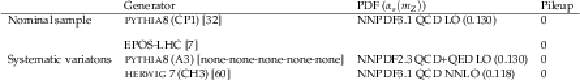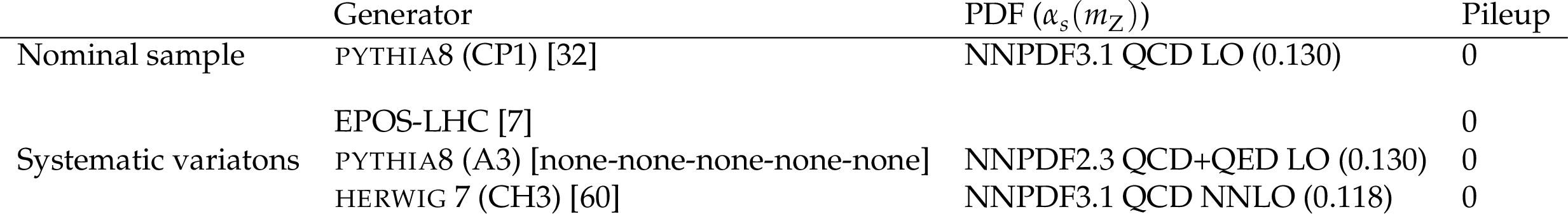 Samples of simulated minimum-bias events used for the unfolding. The pileup in the table represents the number of interactions in addition to the generated hardest interaction, i.e., the total number of interactions minus one for each event. The value of the strong coupling constant, $ \alpha_S $, corresponds to that used in the parton density function (PDF) set. |