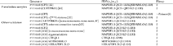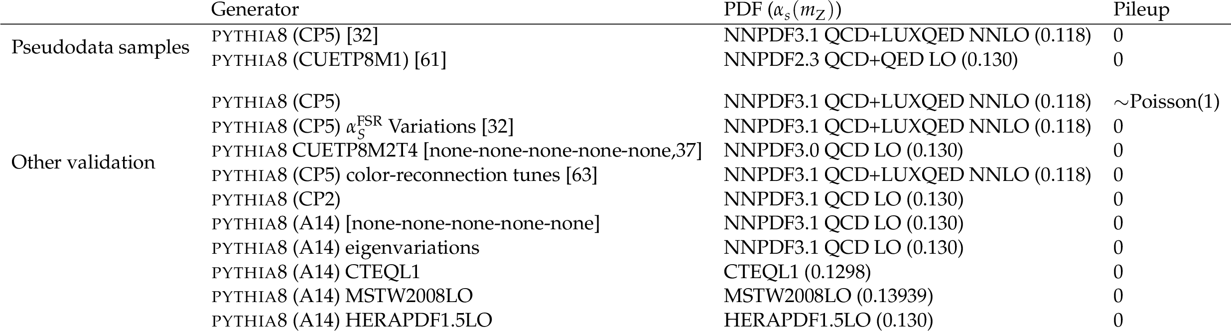 Samples of simulated minimum-bias events used for validation. The pileup in the table represents the number of interactions in addition to the generated hardest interaction, i.e., the pileup is equal to the total number of interactions minus one for each event. The value of $ \alpha_S $ corresponds to that used in the PDF set. |