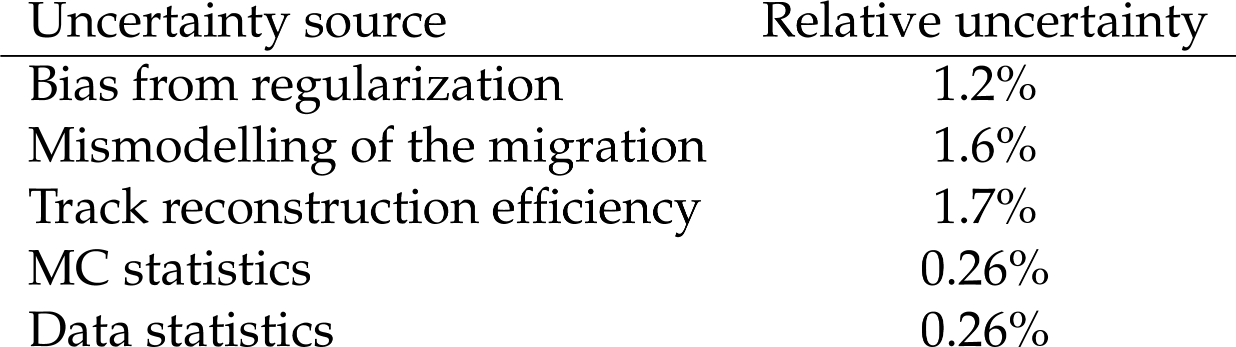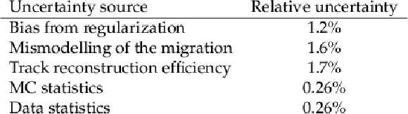 Relative uncertainties of unfolding from different sources, averaged over bins of transverse sphericity. The uncertainty from regularization and that from the mismodelling of the migration are estimated from the square root of the quadrature sum of the differences between the unfolding result using the nominal MC and those using reweighted MC samples to systematic variations. The MC statistical uncertainty is estimated from the statiscal uncertainty of the histogram of weighted MC samples after the unfolding. The data statistical uncertainty is estimated from the standard deviations of the unfolding results to alternative data samples with weight following a Poisson(1) distribution. The average relative uncertainties for the distributions of other observables are similar in size. |