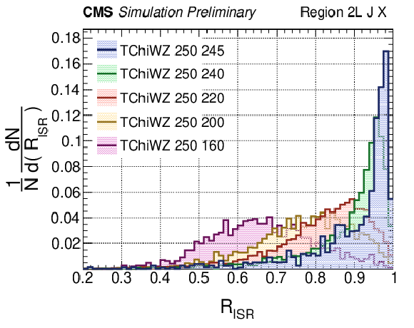 Distributions of $ R_{\rm ISR} $ for simulated events in the 2 lepton final state for TChiWZ signal models with 250 GeV parent mass and various LSP masses ranging from 160-245 GeV (left panel) and standard model backgrounds (right panel). |