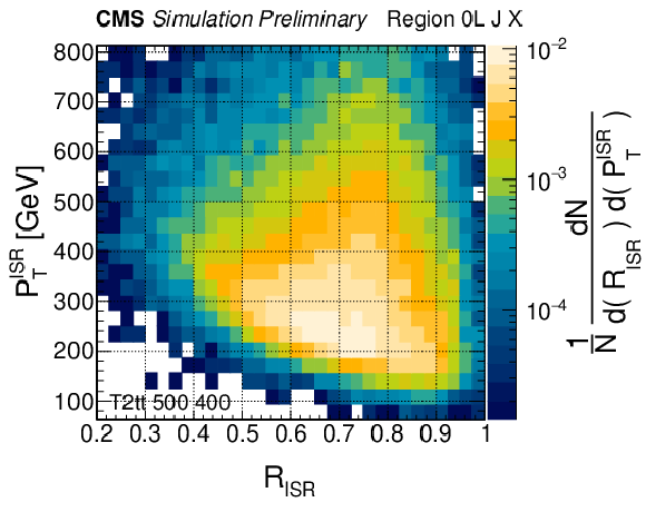 Distributions of $ p_{\rm T}^{\rm ISR} $ vs. $ R_{\rm ISR} $ in events with 0 leptons for simulated top squark signals in the T2tt model with parent mass of 500 GeV and a LSP mass of 400 GeV (left panel), LSP mass of 480 GeV (center panel), and $ {\mathrm{t}\overline{\mathrm{t}}}+\mathrm{jets} $ background (right panel). |