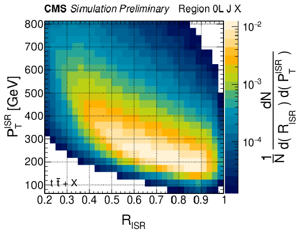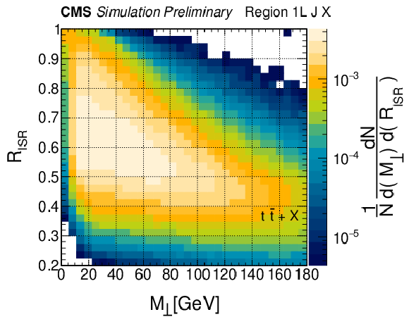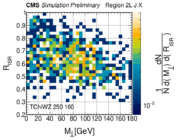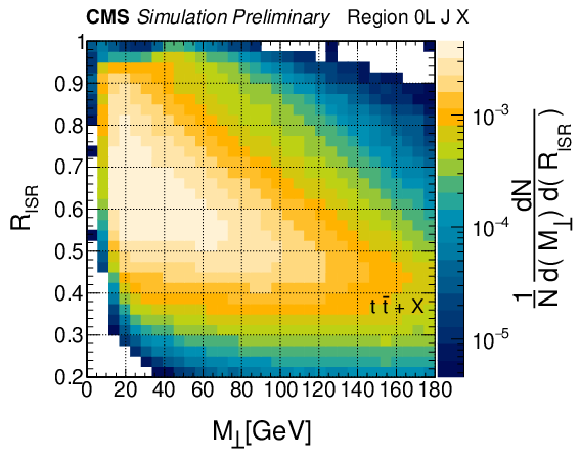 Distributions of $ R_{\rm ISR} $ vs. $ M_{\perp} $ from simulated events in multiple final states. (Top row) $ {\mathrm{t}\overline{\mathrm{t}}}+\mathrm{jets} $ background events in 0L, 1L, and 2L final states. (Middle row) T2tt signals and (bottom row) TChiWZ signals for various sparticle mass combinations. |