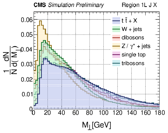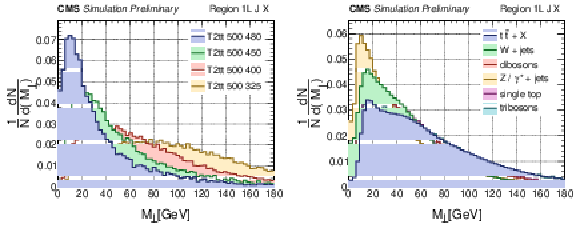 Distributions of $ M_{\perp} $ in 1L final states for simulated events: compressed T2tt signal events with a parent top squark mass of 500 GeV and LSP masses ranging from 325-480 GeV (left panel) and standard model backgrounds (right panel). |