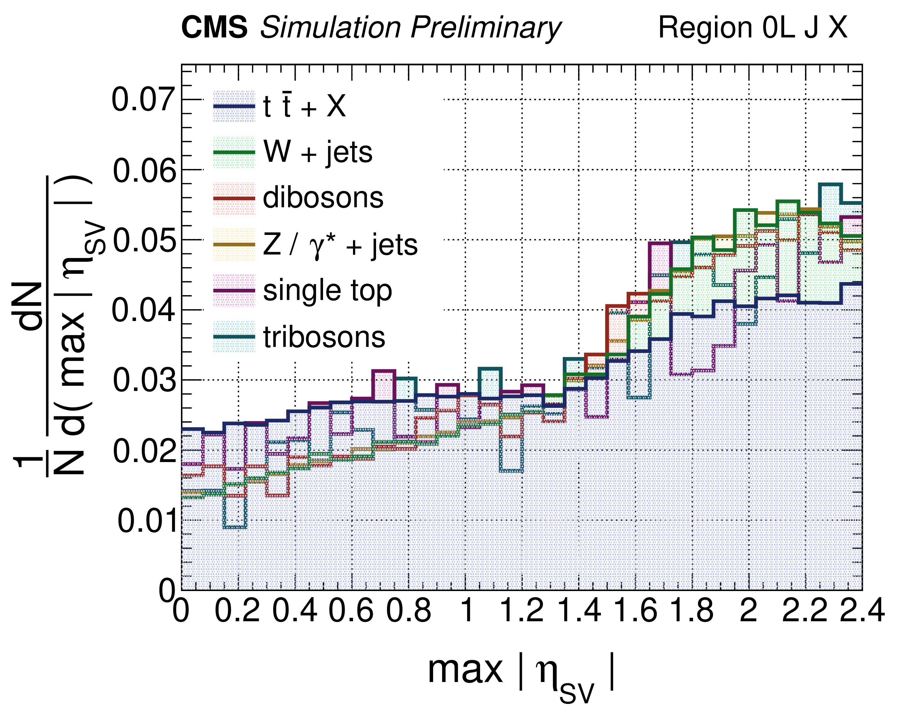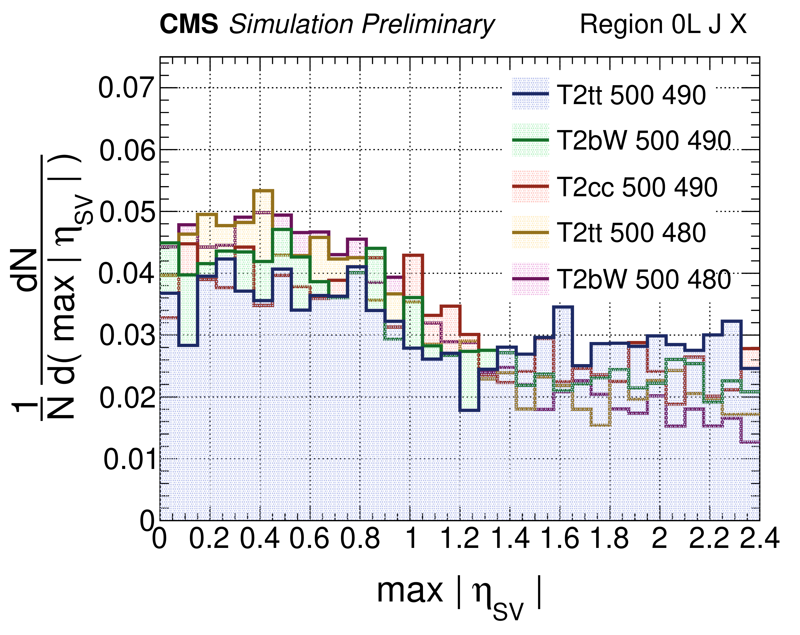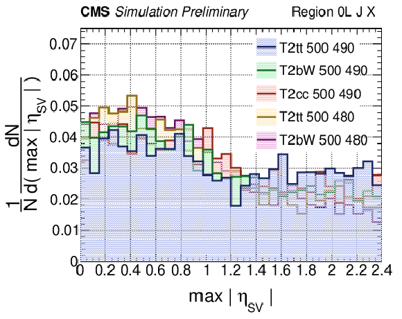 Distributions of $ \eta_{\rm SV}^{\rm S} $ in 0L final states for simulated standard model background events (left panel) and various top squark signal models (right panel). |