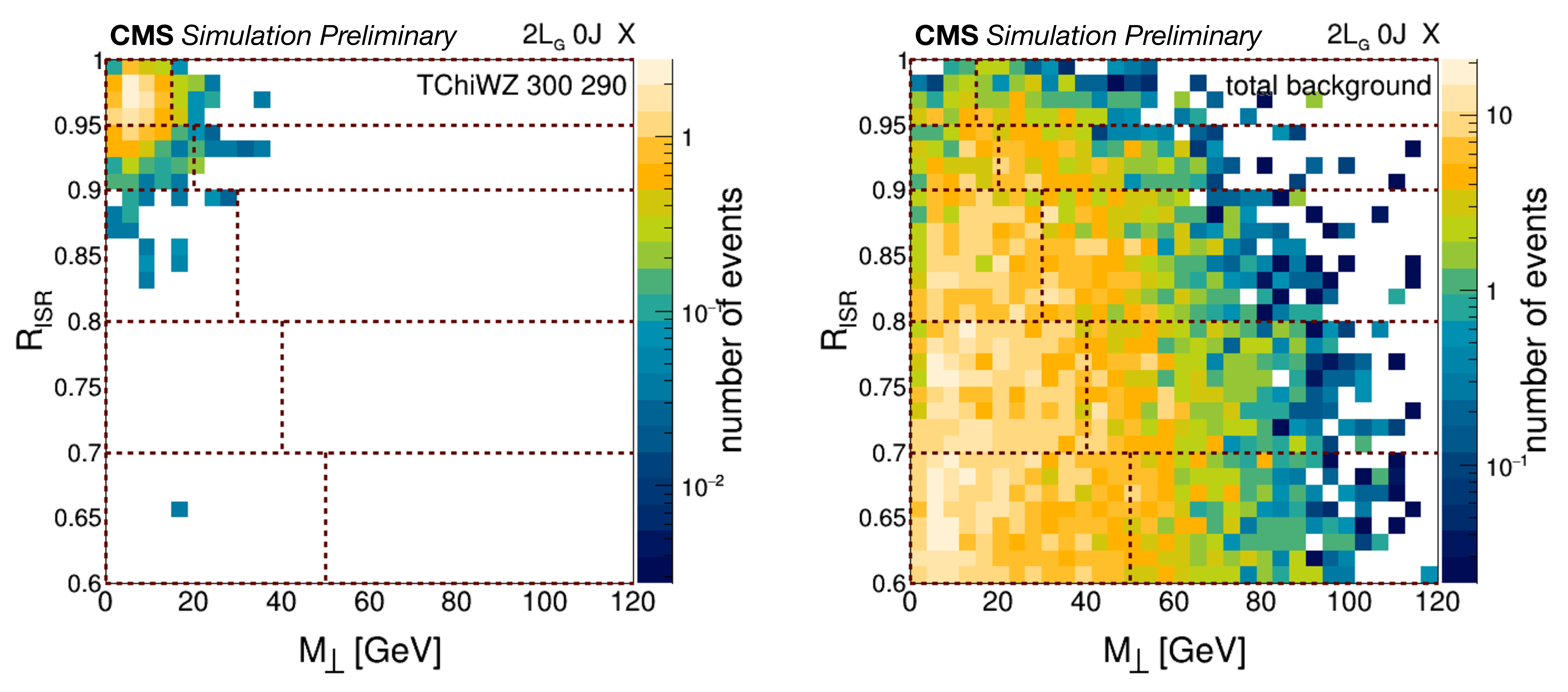 Distributions of $ R_{\rm ISR} $ vs. $ M_{\perp} $ for a TChiWZ signal sample with a parent mass of 300 GeV and a LSP mass of 290 GeV (left panel) and the corresponding total SM background (right panel) for the 2L, 0 S-jet category. The red lines show the bin edges for this particular jet multiplicity. |