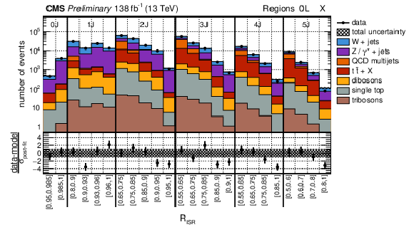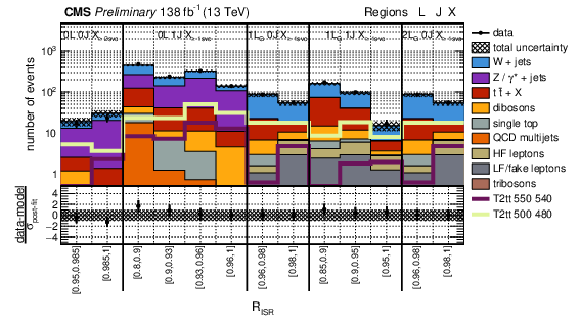 Post-fit distributions of data with the background-only fit model for the complete Run II data set. (Top) 0L and 1L gold regions with larger jet multiplicities. (Bottom) 0L 5J regions separated by $ b $-tagged jet multiplicities in the S and ISR systems. Bins are split by $ R_{\rm ISR} $ with yields integrated over all other sub-categorizations and $ M_{\perp} $. The sub-panels below the panels show the data minus fit model scaled by the post-fit model uncertainty. Expected yields for relevant signal models are superimposed. |