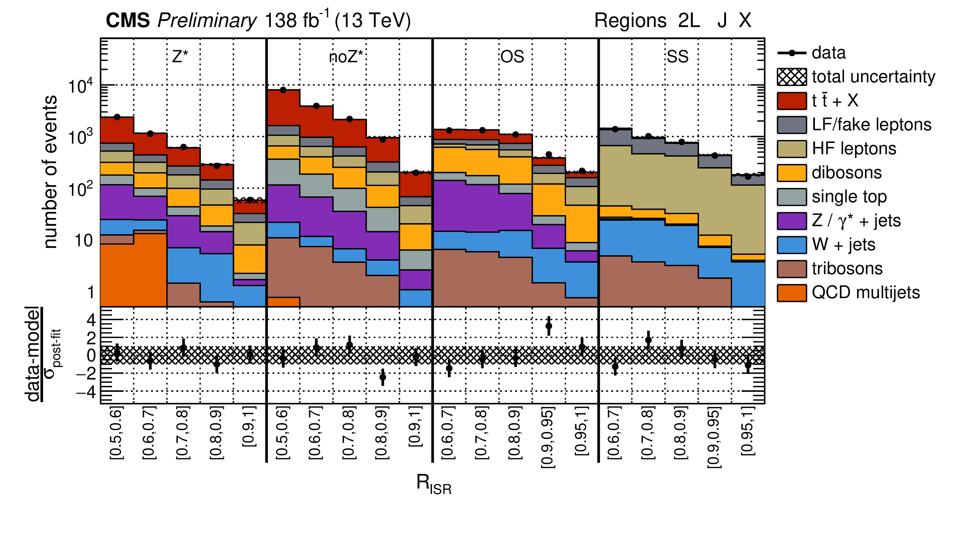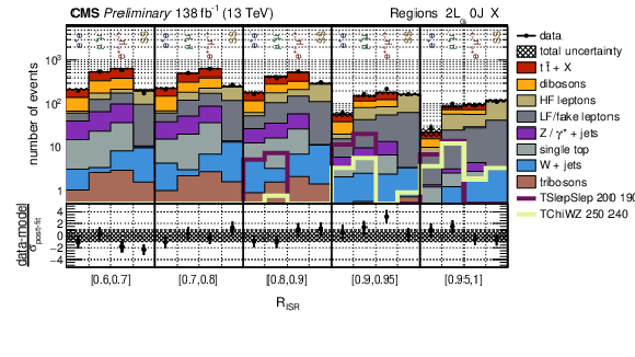 Post-fit distributions of data with the background-only fit model for the complete Run II data set in the 2L region (top panel) and 3L region (bottom panel). Bins are split by $ R_{\rm ISR} $ along with lepton categorization. Yields are integrated over all other sub-categorizations and $ M_{\perp} $. The sub-panels below the panels show the data minus fit model scaled by the post-fit model uncertainty. |