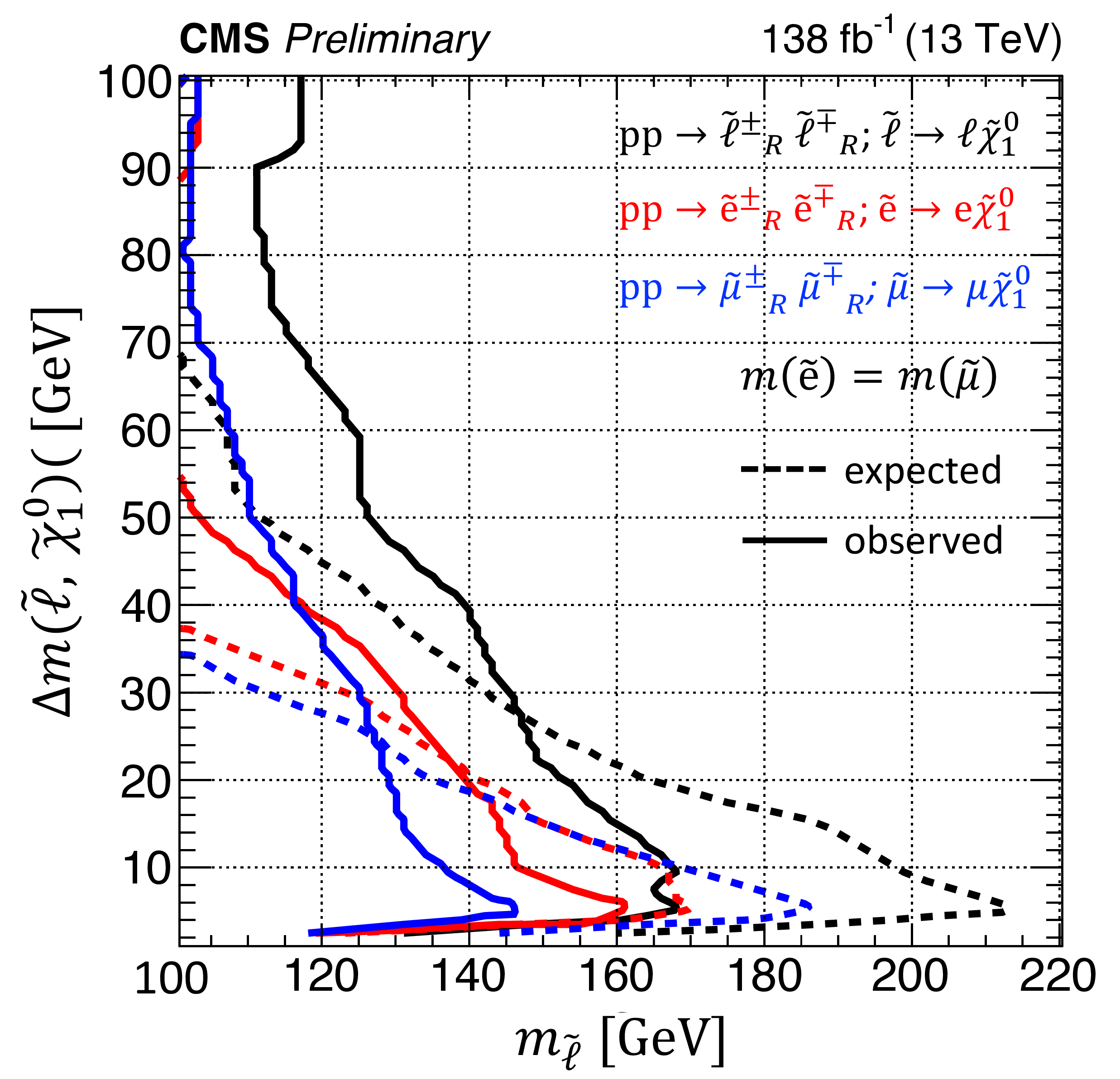 Observed 95% CL upper limits on the product of the cross section and branching fraction squared for direct slepton pair production followed by decay of both sleptons to the corresponding lepton and neutralino (color scale). Slepton $ \tilde{l}_{\mathrm{L}/\mathrm{R}} $ indicates the scalar supersymmetric partner of left- and right-handed electrons and muons. The limit is shown as a function of the slepton mass and the mass difference between the slepton and the lightest neutralino. The regions to the left of the lines denote the regions excluded for a branching fraction of 100%. The median expected exclusion regions for 100% branching fraction are delimited by the dashed lines. |