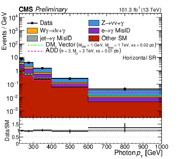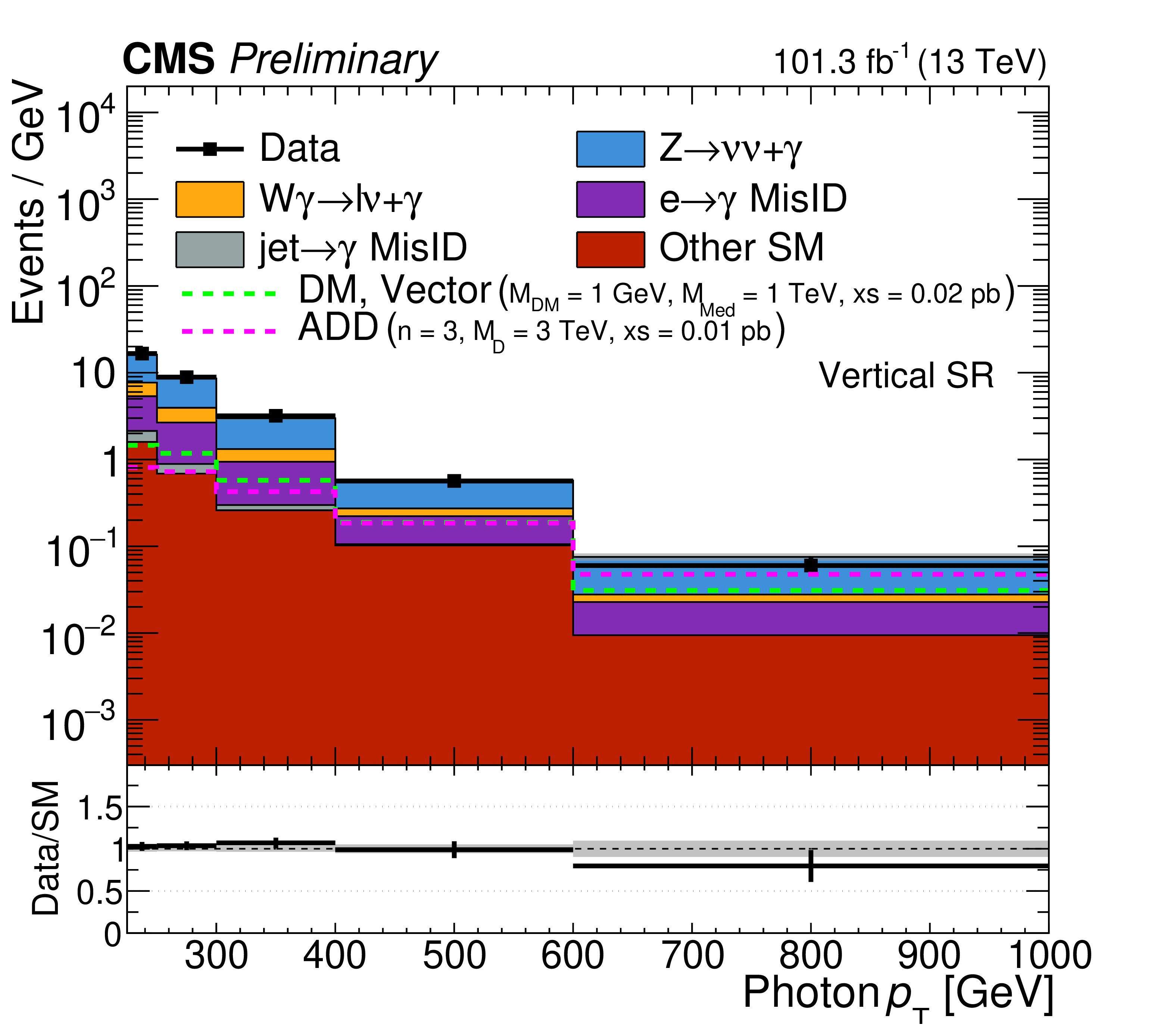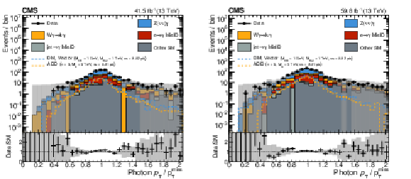 Prefit distribution of $ E_{\mathrm{T}}^{\gamma} $ /$ p_{\mathrm{T}}^\text{miss} $ for the 2017 (left) and 2018 (right) datasets. Templates for signal hypotheses are shown overlaid as light green and magenta dashed lines along with their cross section value. The gray band represents the total systematic and statistical uncertainties. |
