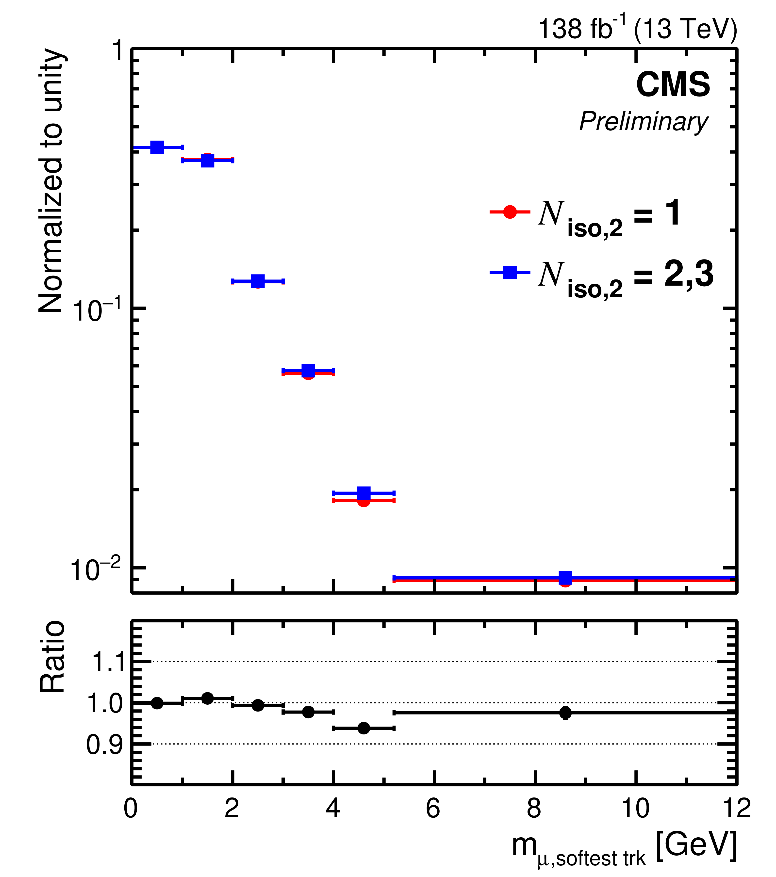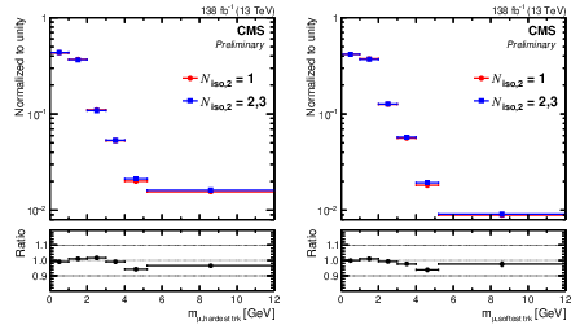 The observed invariant mass distribution, normalized to unity, of the first muon and the softest (left) or hardest (right) accompanying ``signal'' track for different isolation requirements imposed on the second muon: one ``isolation'' track ($ N_\text{iso,2}= $ 1; circles) or two to three ``isolation'' tracks ($ N_\text{iso,2} = 2, $ 3).