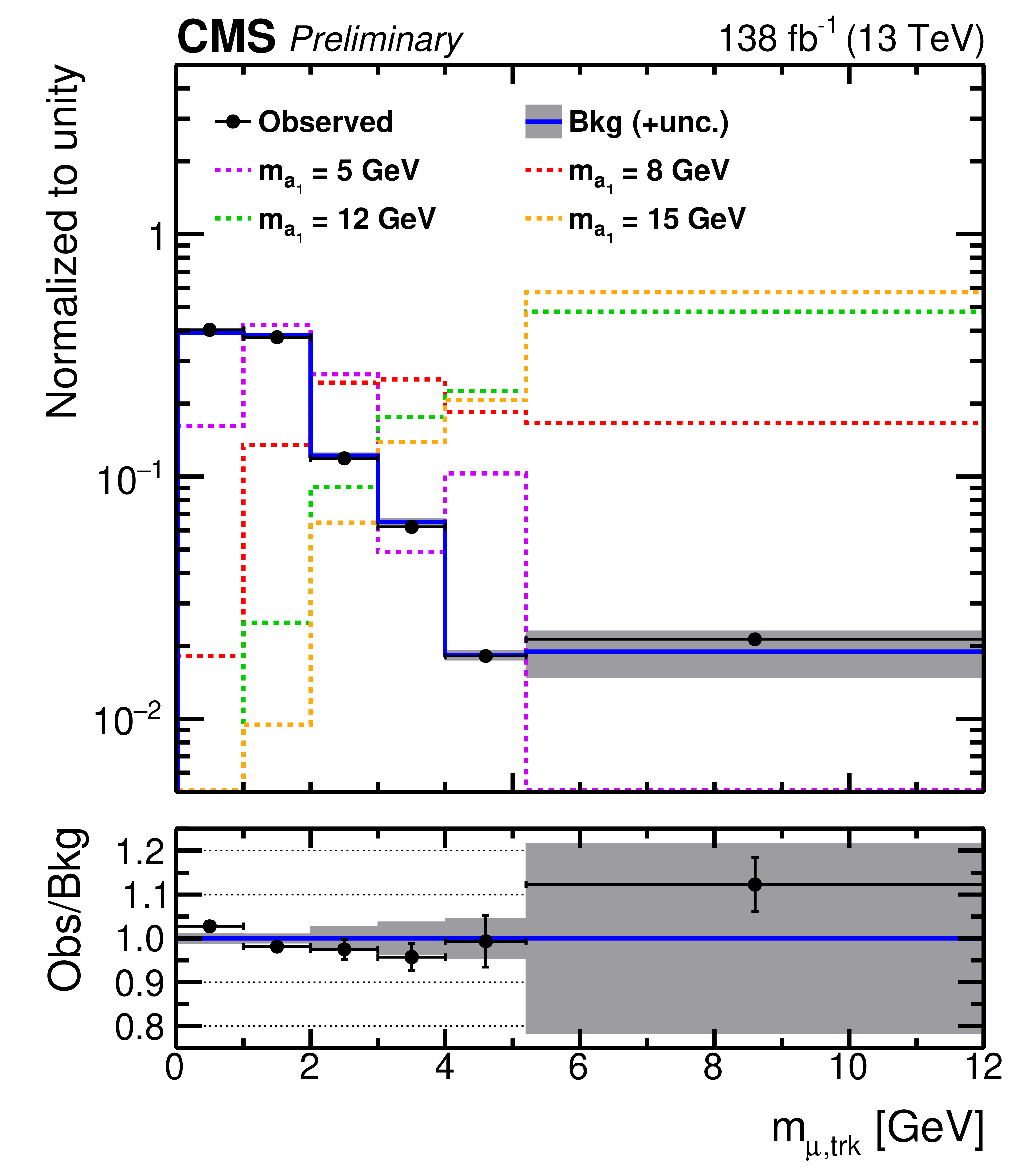 Normalized invariant mass distribution of the muon-track system for events passing the signal selection. Observed events are shown as black points with error bars. The background model in blue is derived from the $ N_{23} $ control region. Also shown are normalized distributions from signal simulations for four mass hypotheses, $ m_{\mathrm{a}_1} $= 5, 8, 12, and 15 GeV (dashed histograms). Signal distributions include both the 2$ \mu$2$\tau $ and 4$ \tau $ contributions. Each event contributes two entries, corresponding to the two muon-track systems in each event that pass the selection. The lower panel shows the ratio of observed to expected background events in each bin. The grey shaded area represents the uncertainty of the background model.