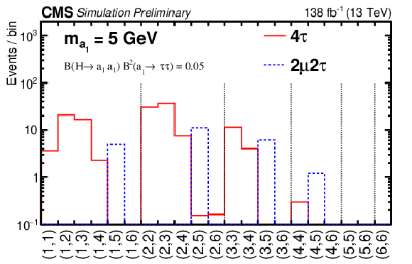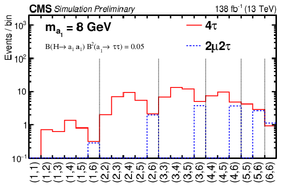 The signal acceptance and the number of expected signal events after selection in the SR. The acceptance is calculated relative to the total H production cross section, using values predicted by the SM. The number of expected signal events is computed for a benchmark value of the branching fraction $ {\mathcal{B}}(\mathrm{H} \to \mathrm{a}_1 \mathrm{a}_1) {\mathcal{B}}^{2} (\mathrm{a}_1 \to \tau \tau)= $ 0.05, assuming SM-predicted cross sections. The quoted uncertainties for the predictions from simulation include only statistical uncertainties.