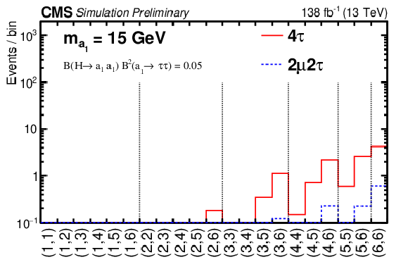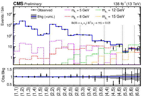 The ($ m_1,m_2 $) in one-row distribution used to extract the signal. The observed number of events is represented by data points with error bars. The background with its uncertainty is shown as the blue histogram with the shaded error band. The normalization for the background is obtained by fitting the observed data under the background-only hypothesis. Signal expectations for the 4$ \tau $ and 2$ \mu$2$\tau $ final states are shown as dashed histograms for the mass hypotheses $ m_{\mathrm{a}_1} $= 5, 8, 12, and 15 GeV. The relative normalization of the 4$ \tau $ and 2$ \mu$2$\tau $ final states are given by Eq. (1) as explained in Section 7. The signal normalization is computed assuming that the H boson is produced in pp collisions with a rate predicted by the SM and decays into $ \mathrm{a}_1 \mathrm{a}_1 \to 4\tau $ final state with the branching fraction of 5%. The lower plot shows the ratio of the observed data events to the expected background yield in each bin of the ($ m_1,m_2 $) distribution.