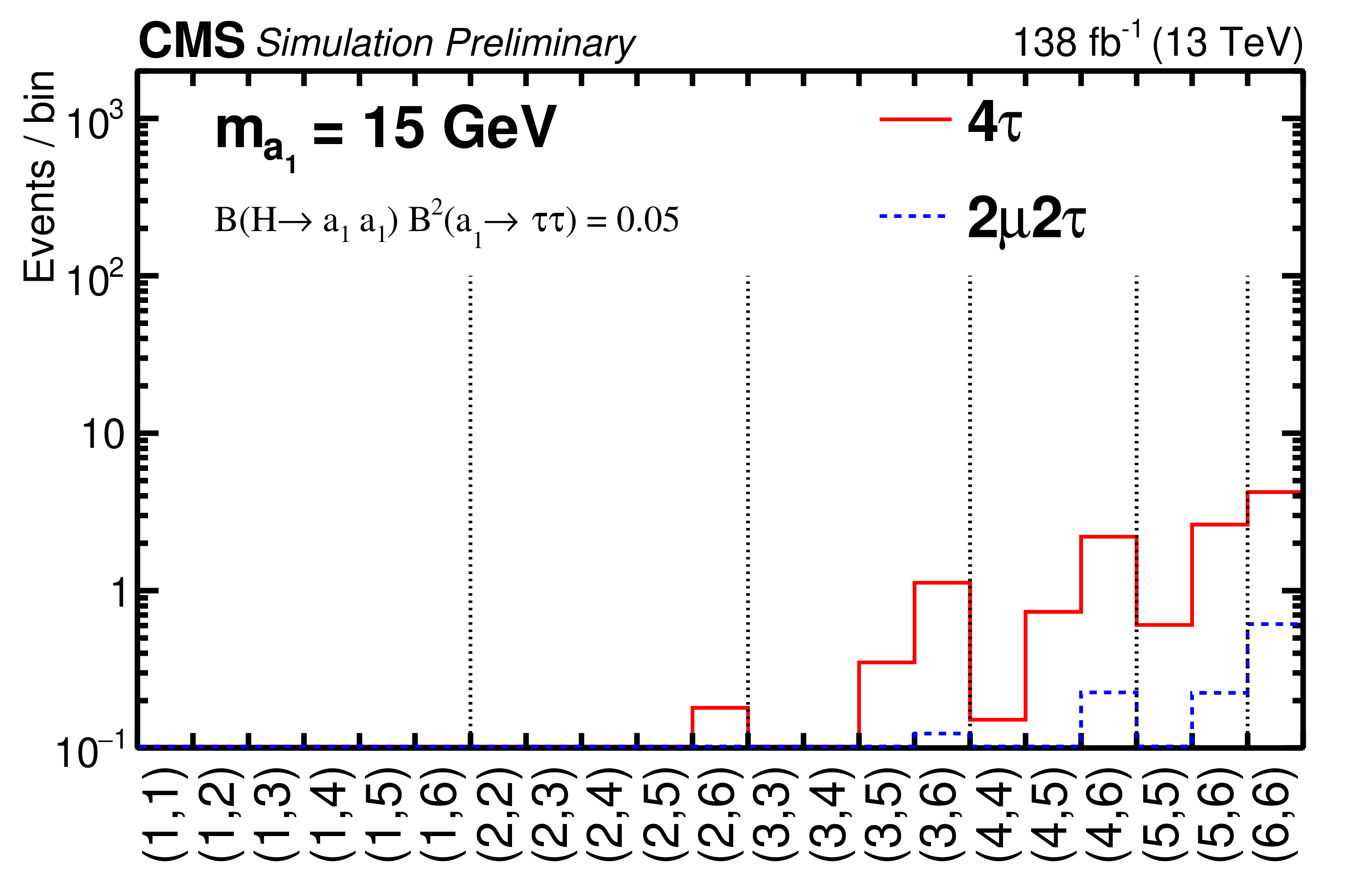 The signal $ f_\text{2D}(i,j) $ templates for mass hypothesis $ m_{\mathrm{a}_1}= $ 5 GeV (upper left), 8 GeV (upper right), 12 GeV (lower left) and 15 GeV (lower right). The $ \mathrm{H}\to\mathrm{a}_1\mathrm{a}_1\to 2\mu 2\tau $ (blue histogram) and $ \mathrm{H}\to\mathrm{a}_1\mathrm{a}_1\to 4\tau $ (red histogram) contributions are shown. The distributions are normalized assuming SM H production cross section and $ {\mathcal{B}} (\mathrm{H}\to\mathrm{a}_1\mathrm{a}_1){\mathcal{B}}^{2}(\mathrm{a}_1\to \tau\tau) $ = 0.05. The bin notation follows that of Fig. 2.