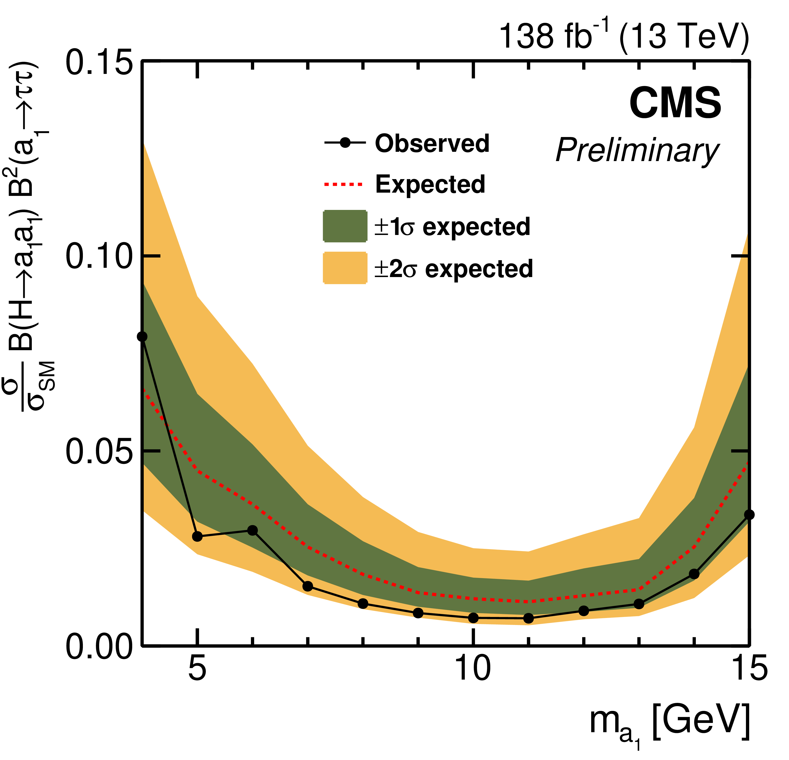 The observed and expected upper limits at 95% confidence level on the product of the signal cross section and the branching fraction $ \sigma (\mathrm{p}\mathrm{p} \to \mathrm{H}+\text{X}) {\mathcal{B}} (\mathrm{H} \to \mathrm{a}_1 \mathrm{a}_1) {\mathcal{B}}^{2} (\mathrm{a}_1 \to \tau \tau) $, relative to the inclusive Higgs boson production cross section $ \sigma_\text{SM} $ predicted in the SM. The green and yellow bands indicate the regions containing 68% and 95% of the distribution of limits expected under the background-only hypothesis.