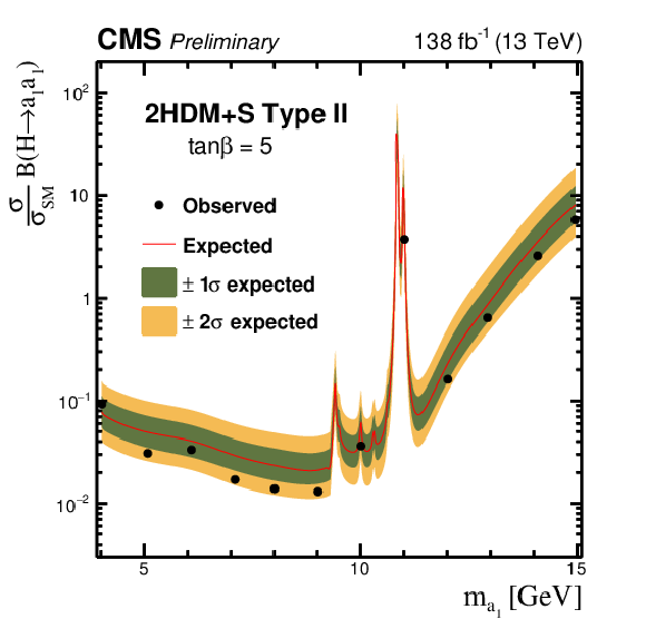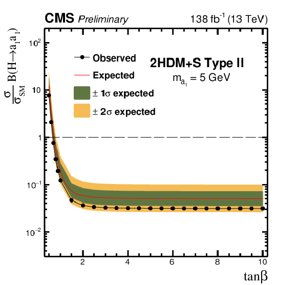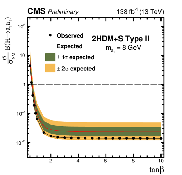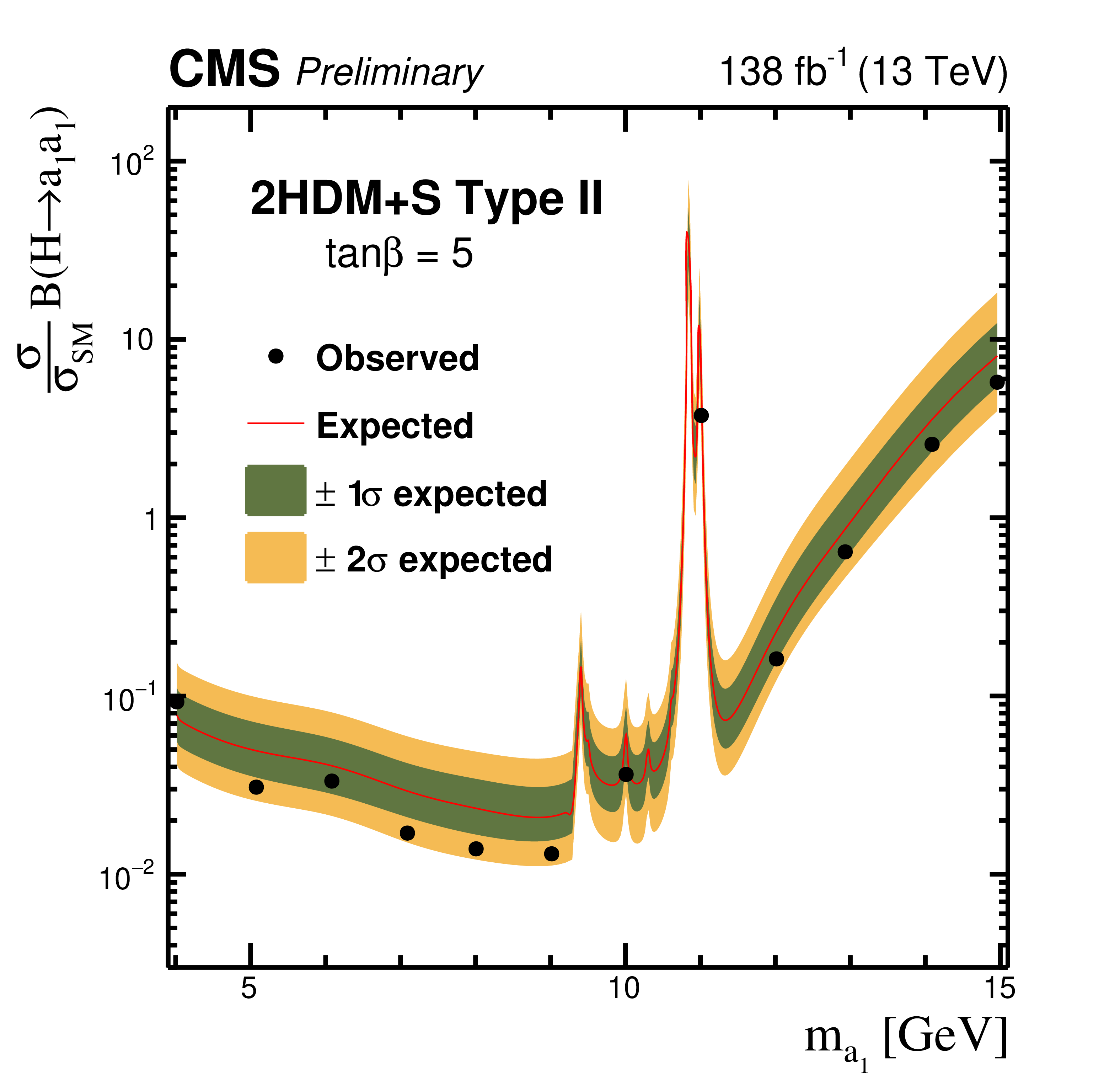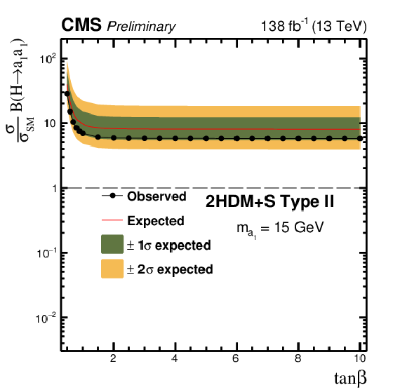The observed and expected 95% CL upper limits on $ \sigma (\mathrm{p}\mathrm{p} \to \mathrm{H}+\text{X}) {\mathcal{B}} (\mathrm{H} \to \mathrm{a}_1 \mathrm{a}_1) $, relative to $ \sigma_\text{SM} $, as a function of $ \tan\beta $ for the Type II 2HDM+S model for: $ m_{\mathrm{a}_1} $= 5 GeV (upper left), $ m_{\mathrm{a}_1} $= 8 GeV (upper right), $ m_{\mathrm{a}_1} $= 12 GeV (lower left) and $ m_{\mathrm{a}_1} $= 15 GeV (lower right).