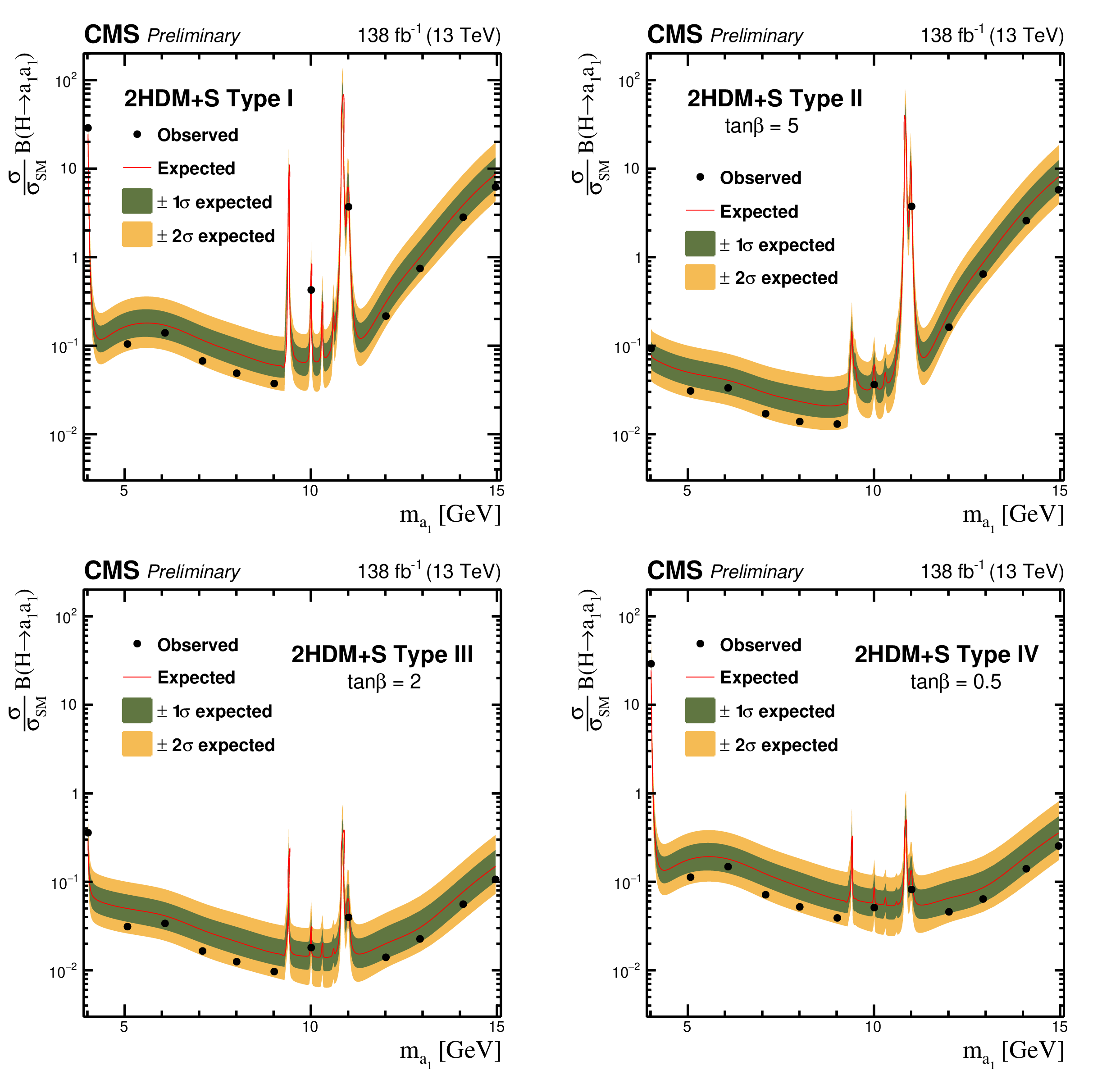 The observed and expected upper limits at 95% CLs on $ \sigma (\mathrm{p}\mathrm{p} \to \mathrm{H}+\text{X}) {\mathcal{B}} (\mathrm{H} \to \mathrm{a}_1 \mathrm{a}_1) $, relative to $ \sigma_\text{SM} $, as a function of $ m_{\mathrm{a}_1} $ for different 2HDM+S models for benchmark $ \tan\beta $ values: Type I ($ \tan\beta $ independent; upper left), Type II ($ \tan\beta = $ 5; upper right), Type III ($ \tan\beta = $ 2; lower left) and Type IV ($ \tan\beta = $ 0.5; lower right).