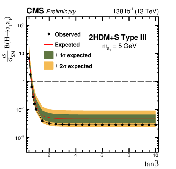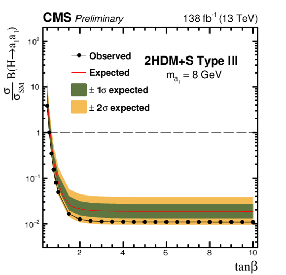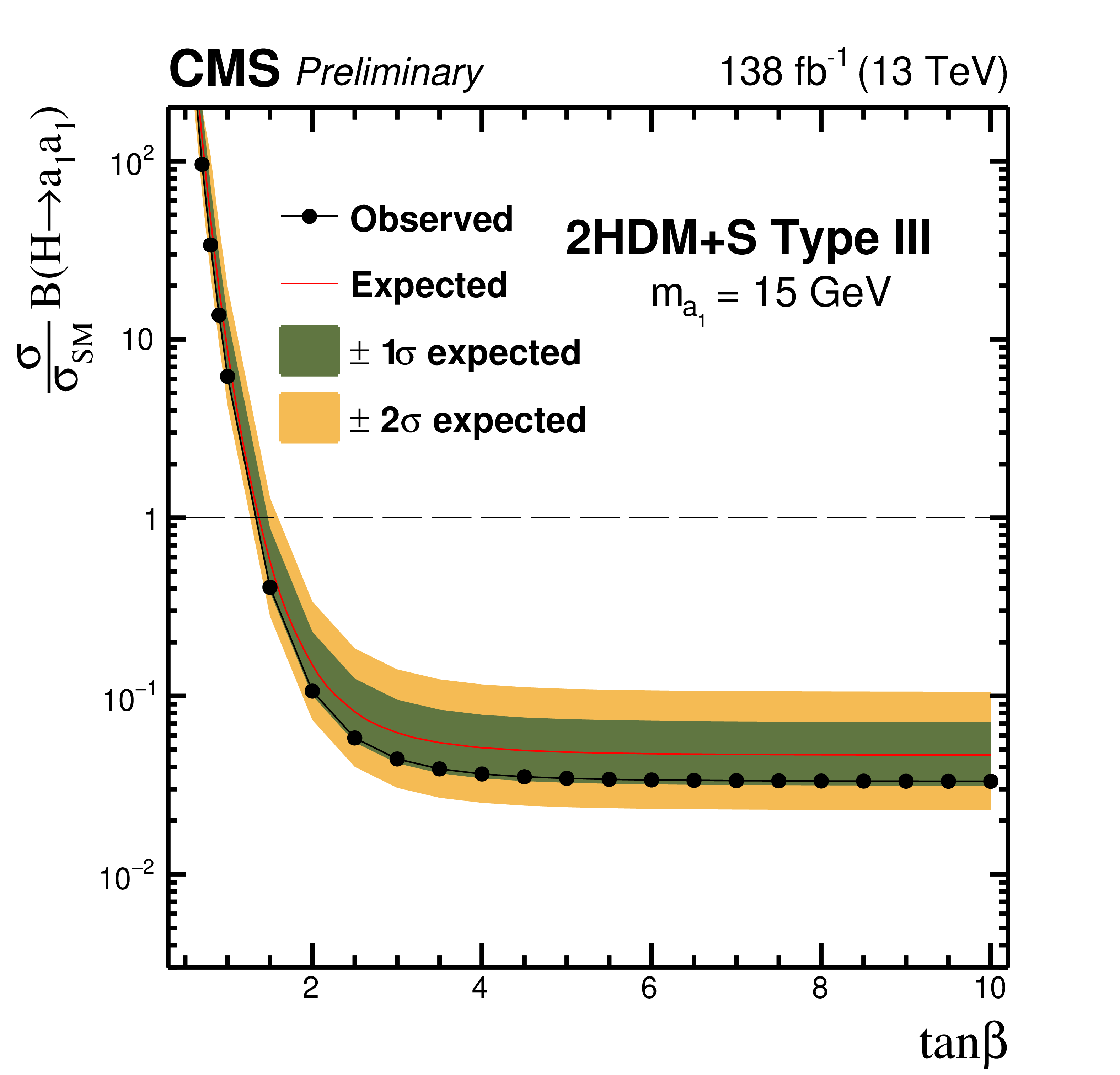 The observed and expected 95% CL upper limits on $ \sigma (\mathrm{p}\mathrm{p} \to \mathrm{H}+\text{X}) {\mathcal{B}} (\mathrm{H} \to \mathrm{a}_1 \mathrm{a}_1) $, relative to $ \sigma_\text{SM} $, as a function of $ \tan\beta $ for the Type III 2HDM+S model for: $ m_{\mathrm{a}_1} $= 5 GeV (upper left), $ m_{\mathrm{a}_1} $= 8 GeV (upper right), $ m_{\mathrm{a}_1} $= 12 GeV (lower left) and $ m_{\mathrm{a}_1} $= 15 GeV (lower right).