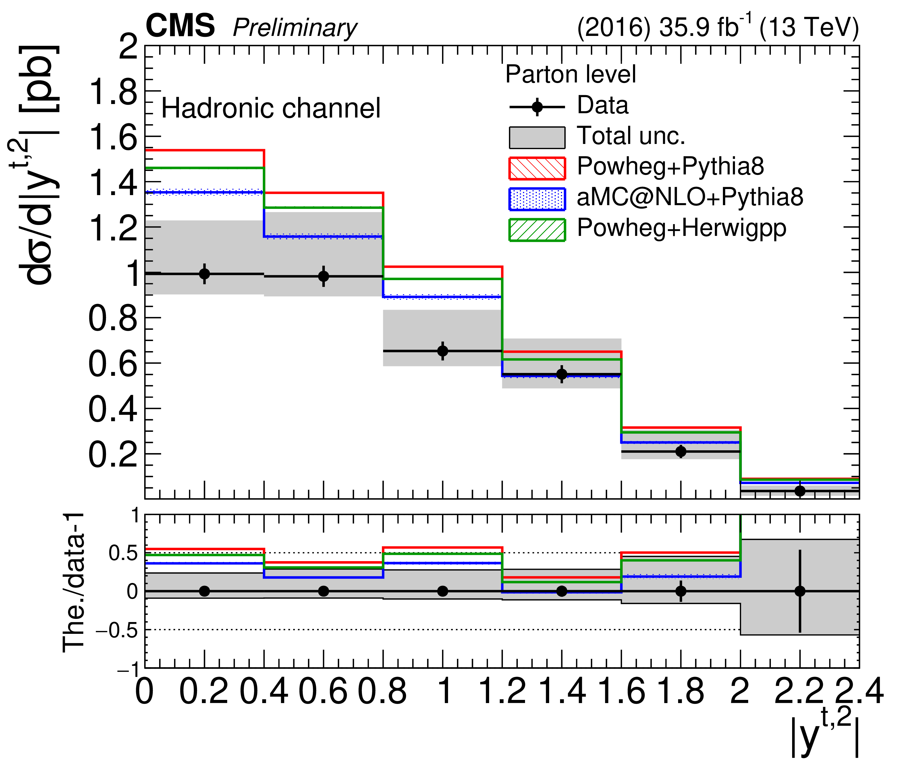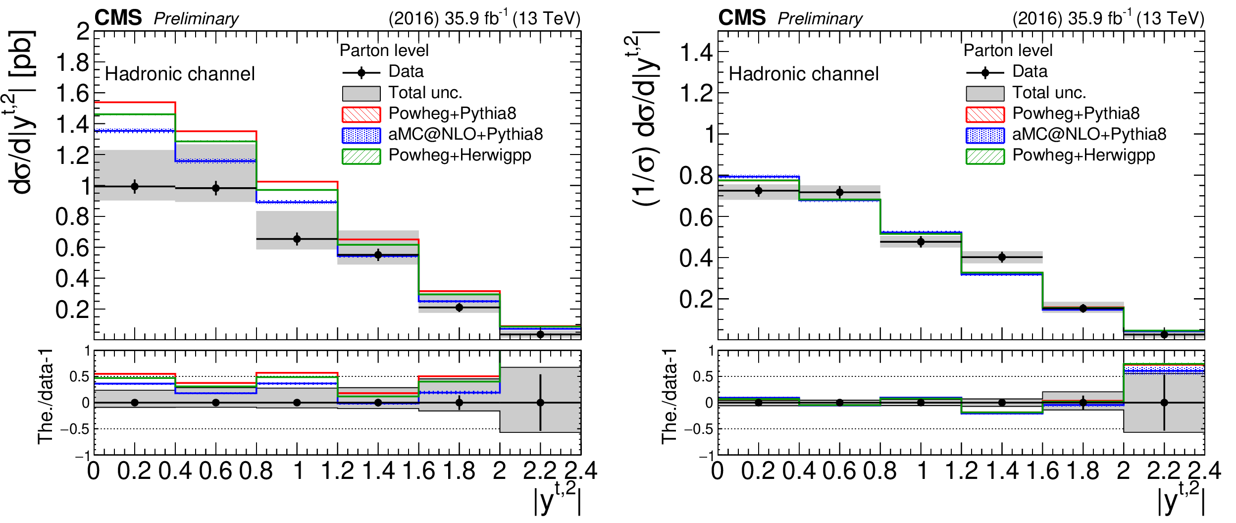 Differential cross section unfolded to the particle level, absolute (left) and normalized (right), as a function of the second top quark $|y|$ in the hadronic channel. The bottom panel shows the ratio (theory $-$ data)/data. The uncertainties on the data markers are statistical, while the grey band shows the total statistical and systematic uncertainty. |