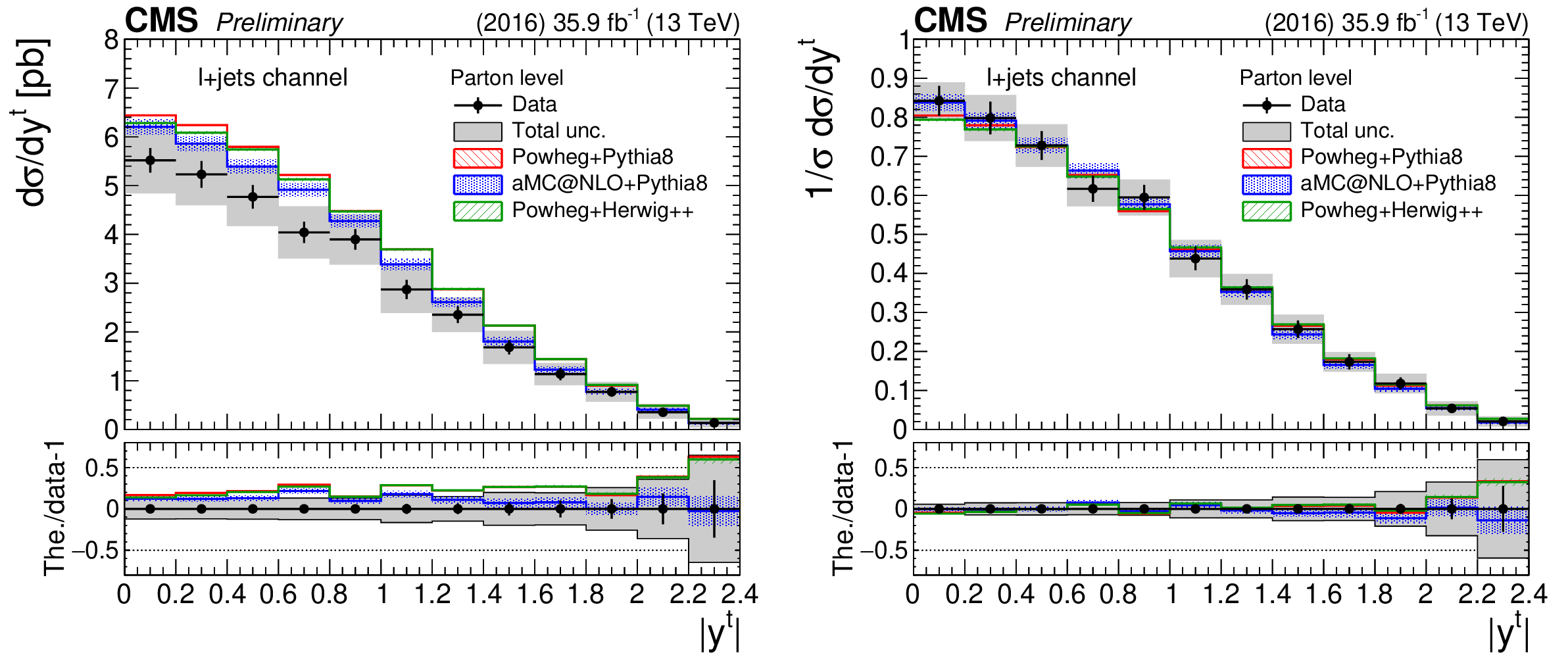 Differential cross section measurements at the parton level as a function of the parton-level top quark $|y|$ for the $\ell $+jets channel. Both absolute (left) and normalized (right) cross sections are shown. The uncertainties on the data markers are statistical, while the grey band shows the total statistical and systematic uncertainty. |