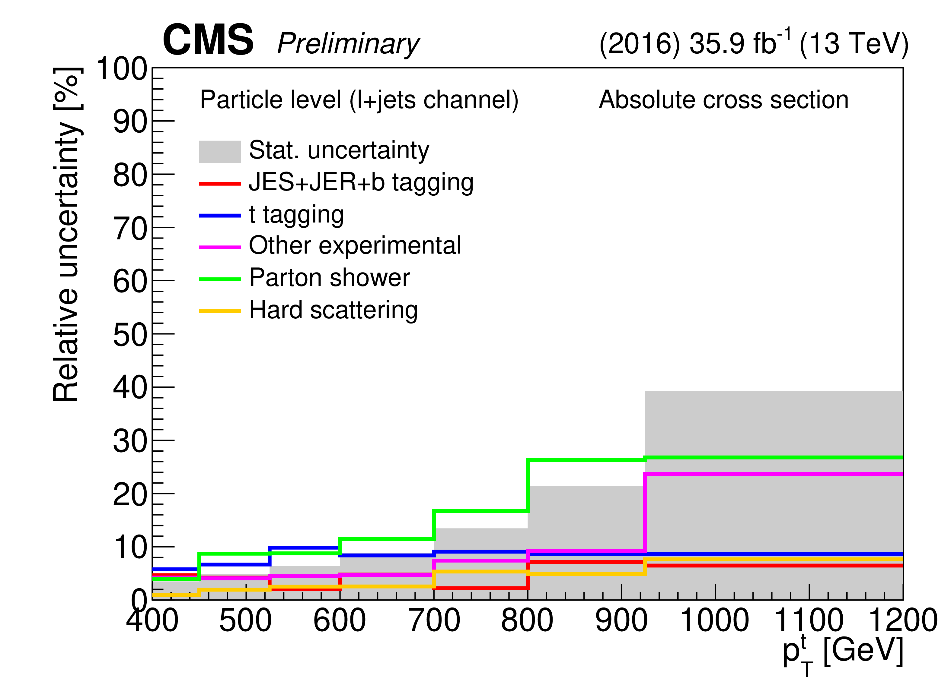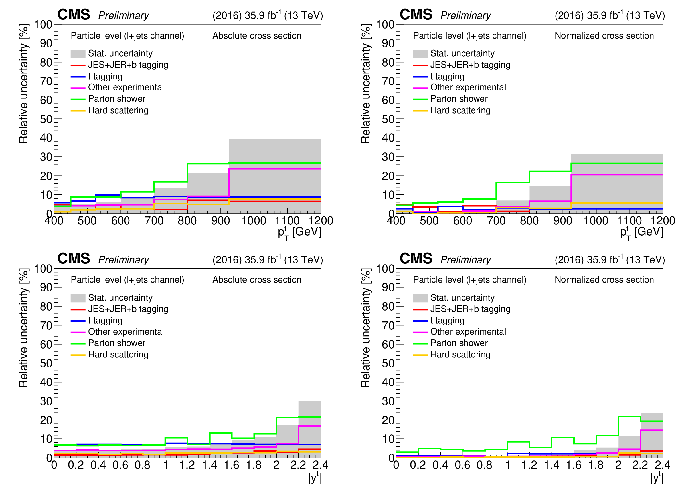 Breakdown of the sources of systematic uncertainty affecting the differential cross section measurements in the $\ell $+jets channel at the particle level as a function of the particle-level t jet $ {p_{\mathrm {T}}} $ (top row) or $|y|$ (bottom row). Both the systematic uncertainties in the absolute (left column) and the normalized (right column) cross sections are shown. "JES+JER+b tagging" includes uncertainties due to the jet energy scale, jet energy resolution, and small-$R$ jet b tagging efficiency; "t tagging" is the uncertainty associated with the large-$R$ jet t tagging efficiency; "Other experimental" includes the uncertainties originating from the background estimate, pileup modeling, lepton identification and trigger efficiency, and measurement of the integrated luminosity; "Parton shower" includes contributions from initial- and final-state radiation, underlying event tune, ME-PS matching, and color reconnection; "Hard scattering" includes the uncertainty due to PDFs as well as renormalization and factorization scales. |