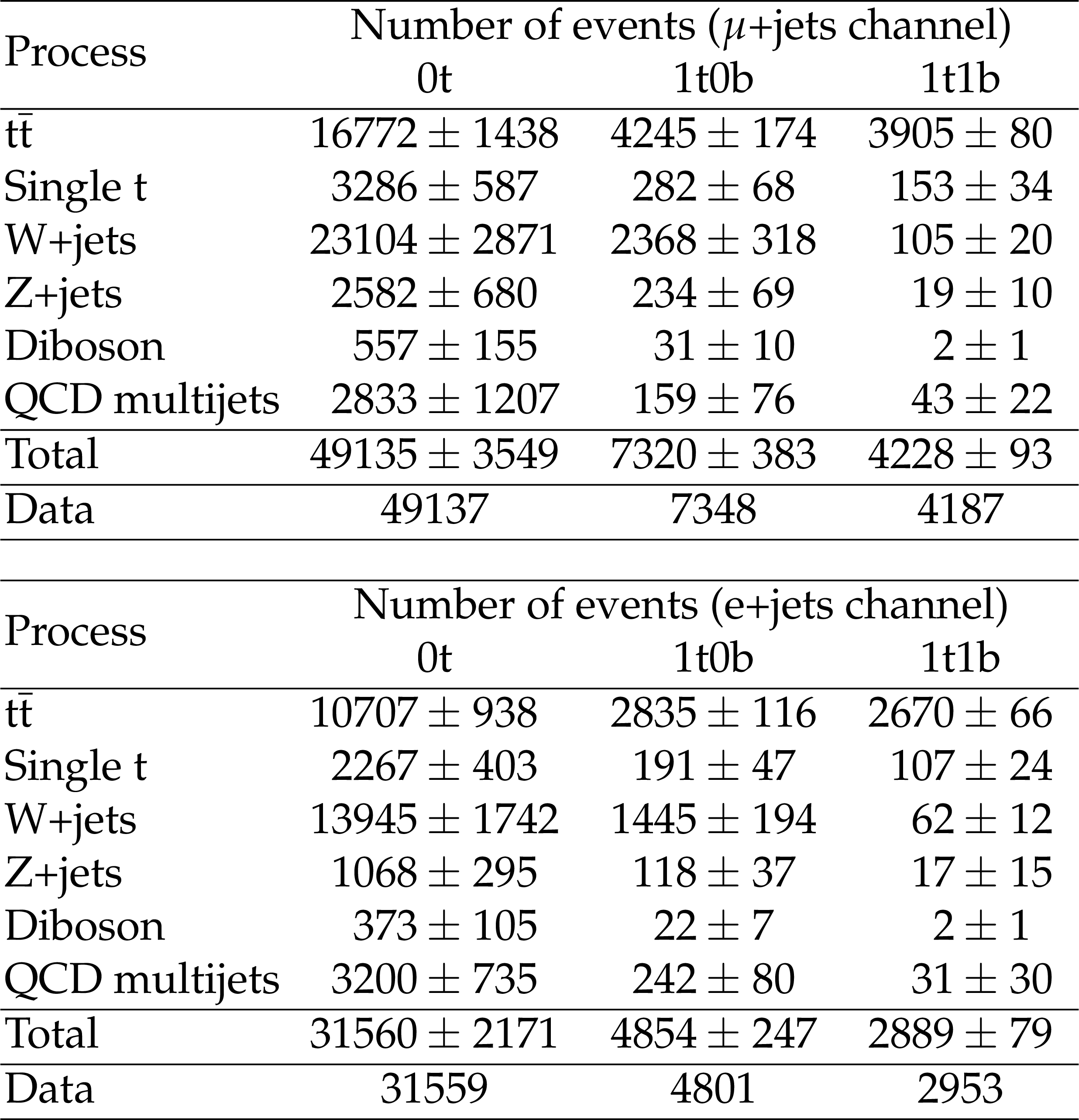 Posterior signal and background event yields in the 0t, 1t0b, and 1t1b categories, together with the observation in data. The uncertainties include all posterior experimental uncertainties. |
