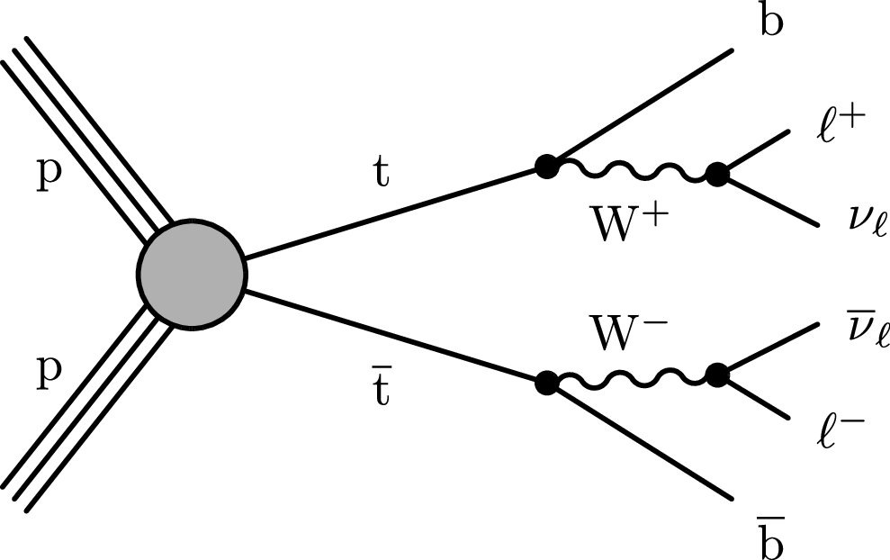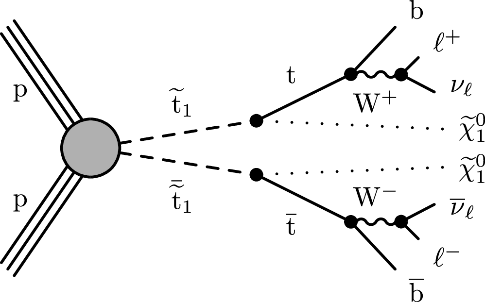 In the left diagram the standard model $ \mathrm{t} \overline{\mathrm{t}} $ process is sketched, while the right diagram shows the production of a hypothetical stop pair, where both stops decay to a top and a neutralino. This analysis focuses on signatures, where both of the W bosons decay leptonically. |