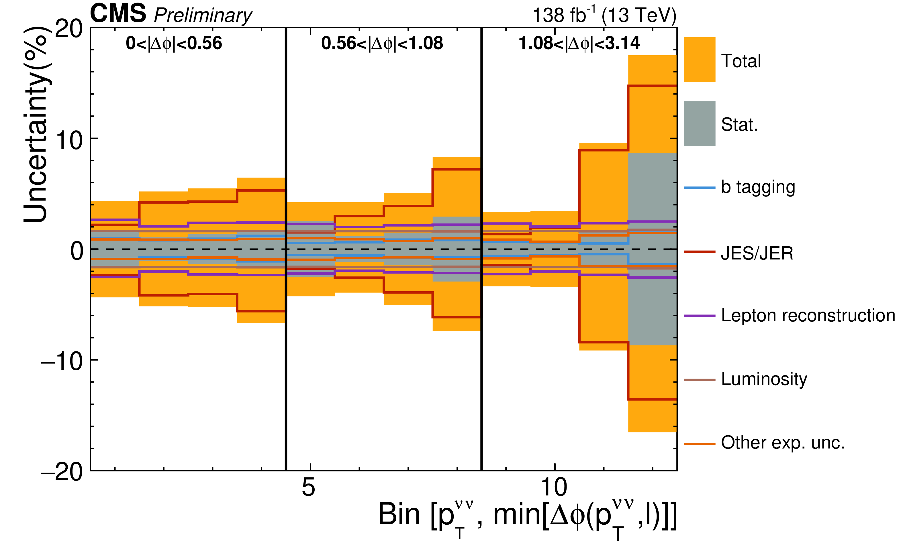 Breakdown of the relative uncertainties from experimental (left) and theory (right) uncertainties on the differential cross section measurement as a function of $ p_{\text{T}}^{\nu\nu} $ (top), $ \text{min}[\Delta\phi(p_{\text{T}}^{\nu\nu},\ell)] $ (center) and both variables (bottom). In the latter case, each group of 4 bins corresponds to $ p_{\text{T}}^{\nu\nu} $ bins, and $ \text{min}[\Delta\phi(p_{\text{T}}^{\nu\nu},\ell)] $ bin edges are indicated by vertical dashed lines. The statistical uncertainty (dark grey) takes the available statistics of both the simulated samples and the recorded data into account. |